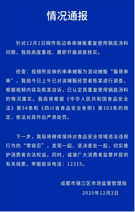 成都锦江区市监局通报“街边串串摊贩重复使用锅底汤料问题”:情况属实,依法作出严肃处罚
