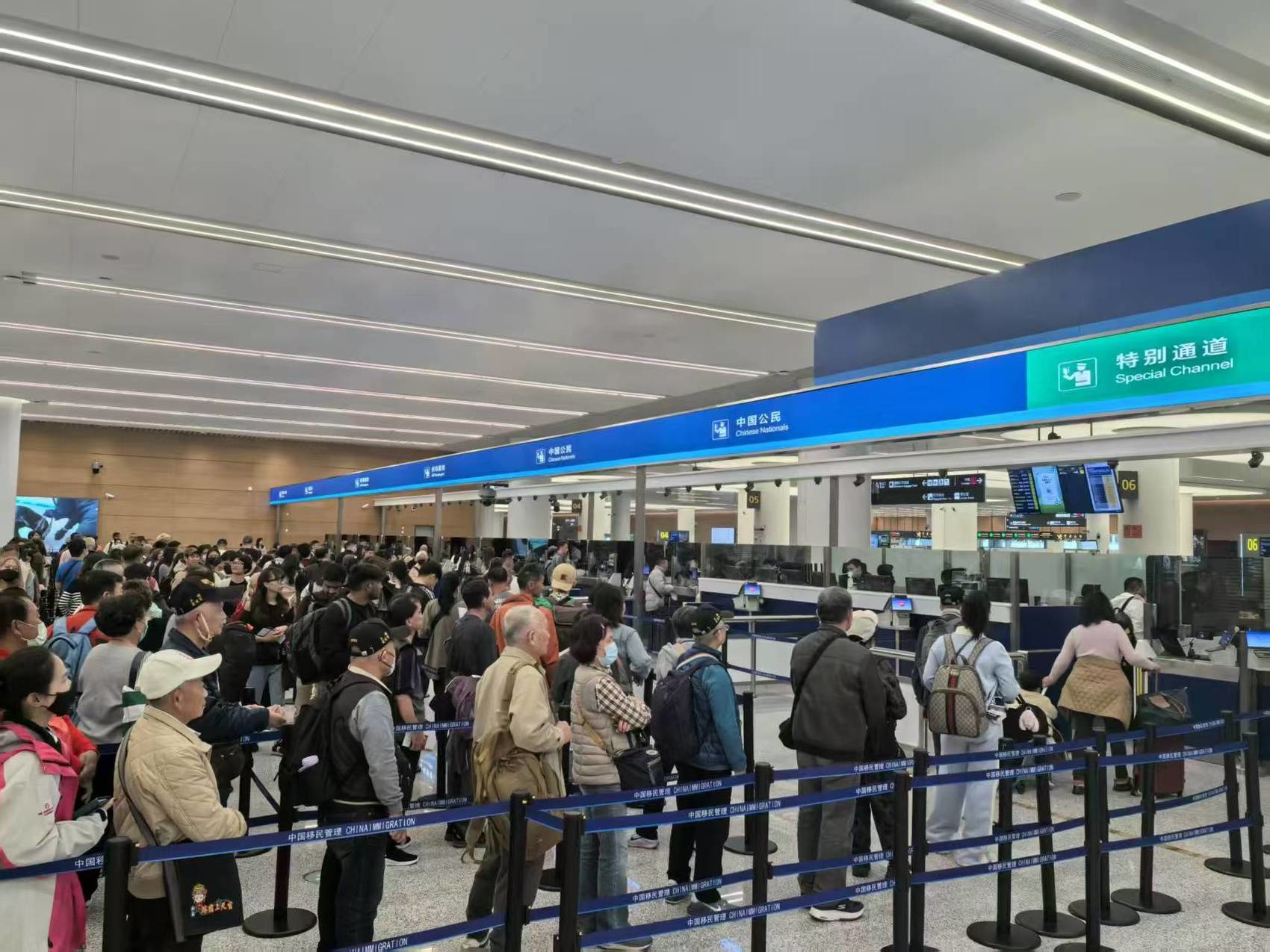 旅客在天府国际机场边检入境大厅候检