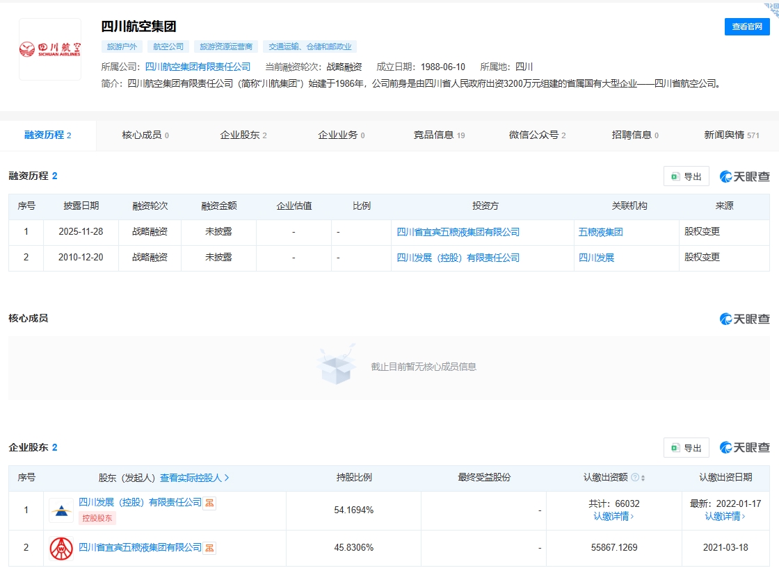 此前,川航集团由四川发展(控股)有限责任公司全资控股。此次变更后,由四川发展(控股)有限责任公司、四川省宜宾五粮液集团有限公司共同持股。其中,四川发展持股54.1694%,五粮液集团持股45.8306%。