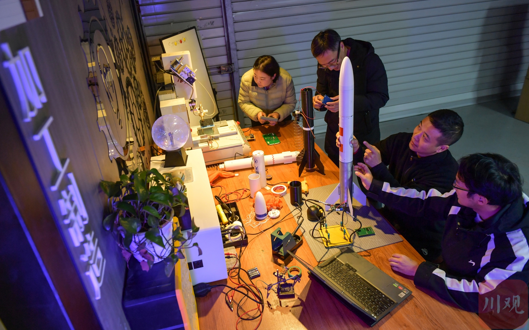 2025年12月2日,在位于四川省成都市双流区的电子科大科技园(天府园)成电创客基地,科创团队成员对研发的“小型探空火箭”进行发射前组装和研讨。