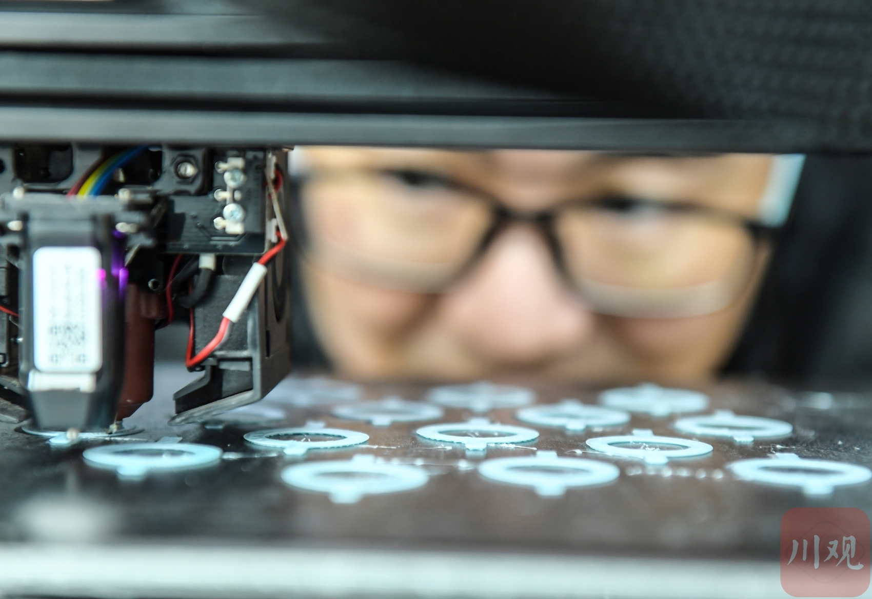2025年12月2日,在位于四川省成都市双流区的电子科大科技园(天府园)成电创客基地,科创团队成员正在观察研发产品运用到的零件进行3D打印。