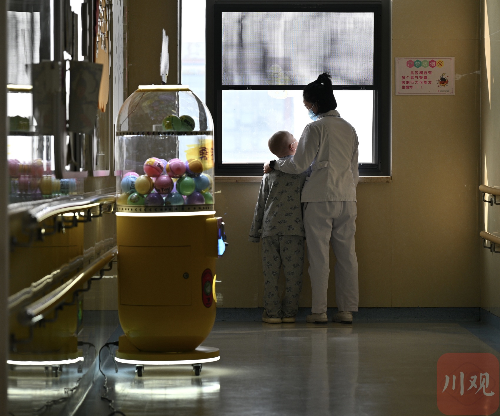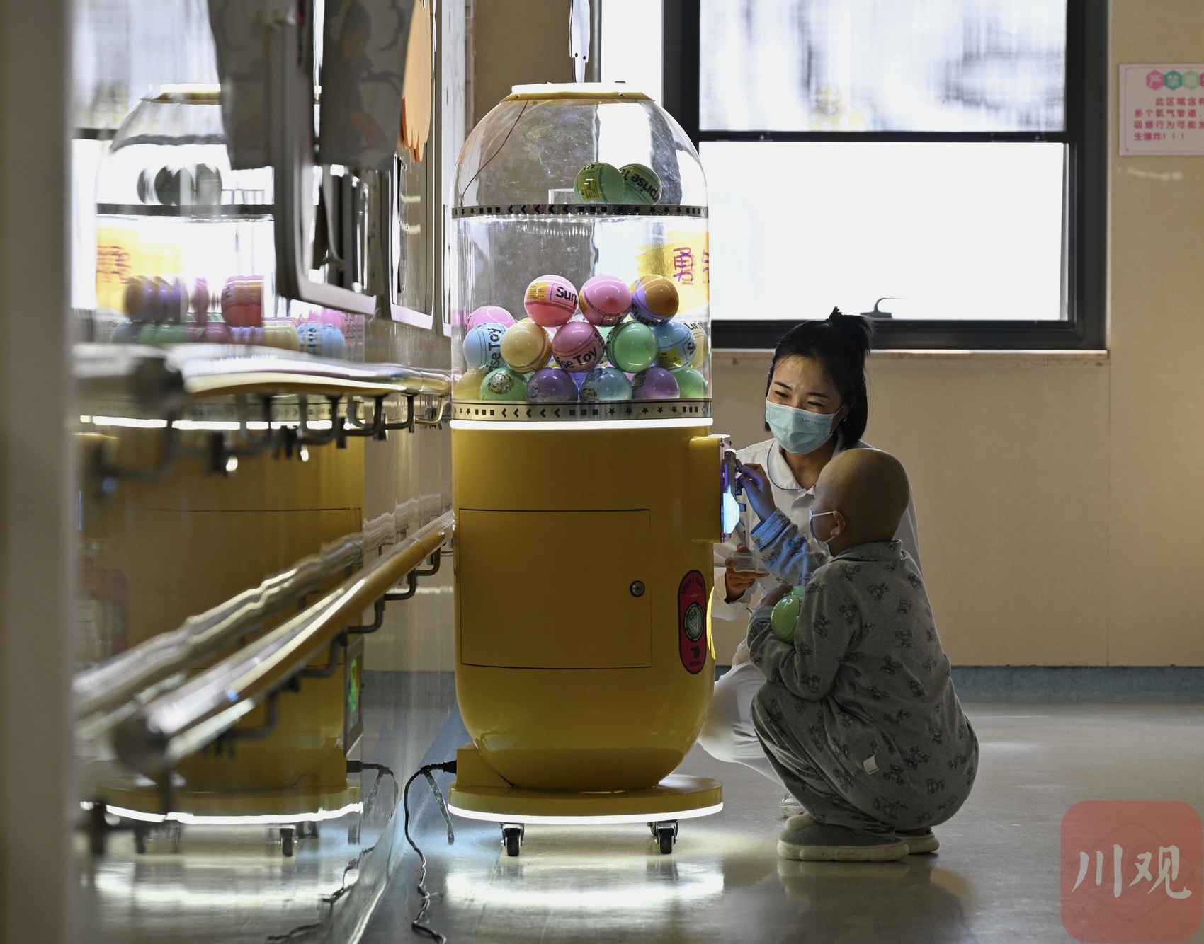 12月3日,成都市妇女儿童中心医院儿童血液肿瘤科病区的角落里,新设置的一台多巴胺配色扭蛋机,吸引小患者们的目光。