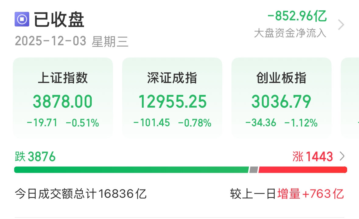 12月3日,A股三大指数集体回调,其中创业板剧烈波动,开盘快速冲高1%之后,快速跳水一度跌超1%。截至收盘,沪指跌0.51%,收报3878.00点;深成指跌0.78%,收报12955.25点;创业板指跌1.12%,收报3036.79点。全市场全天成交额达到16836亿元,较昨日放量763亿元。全市场下跌个股超3800只,仅1400余只个股上涨。