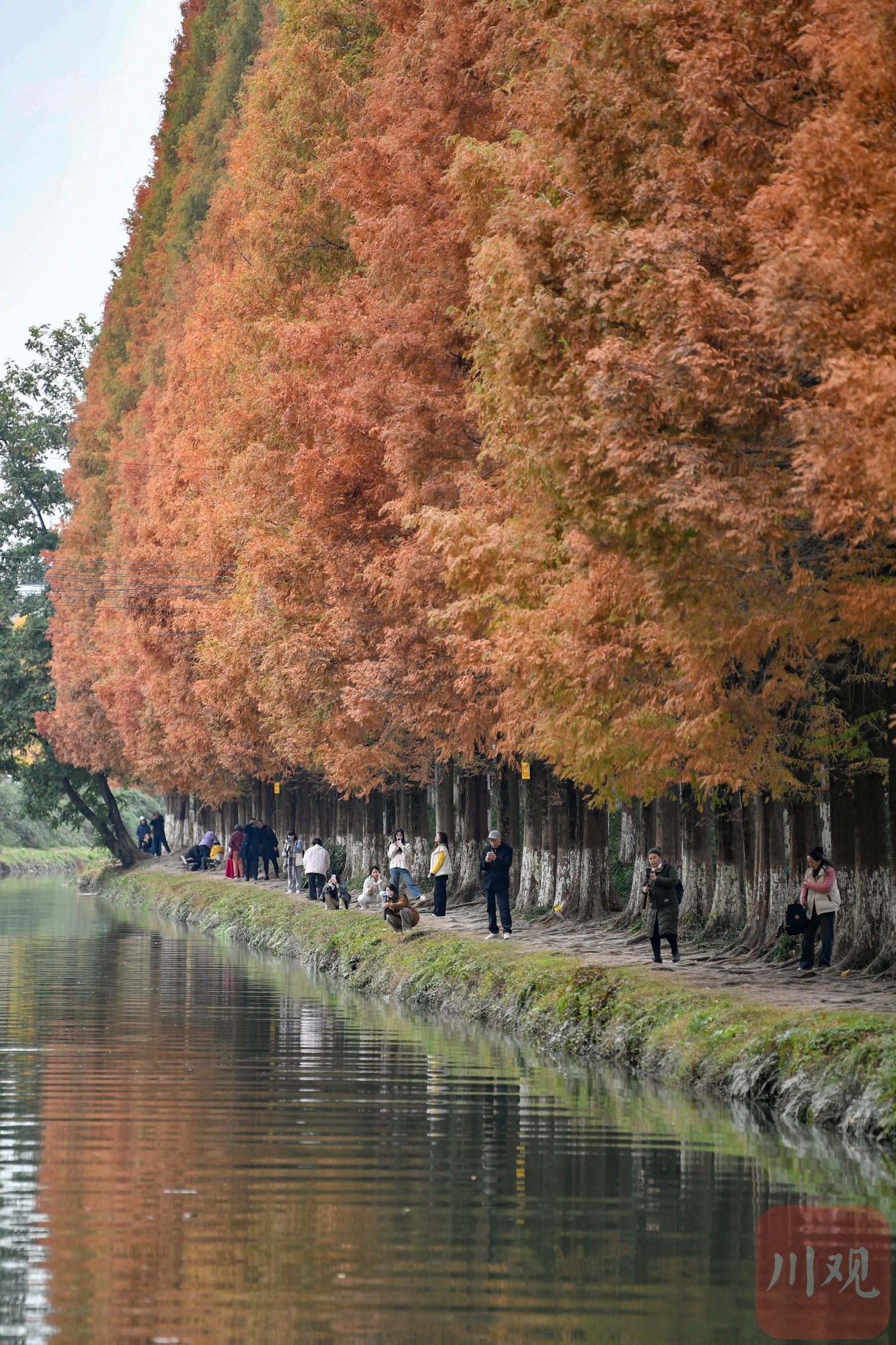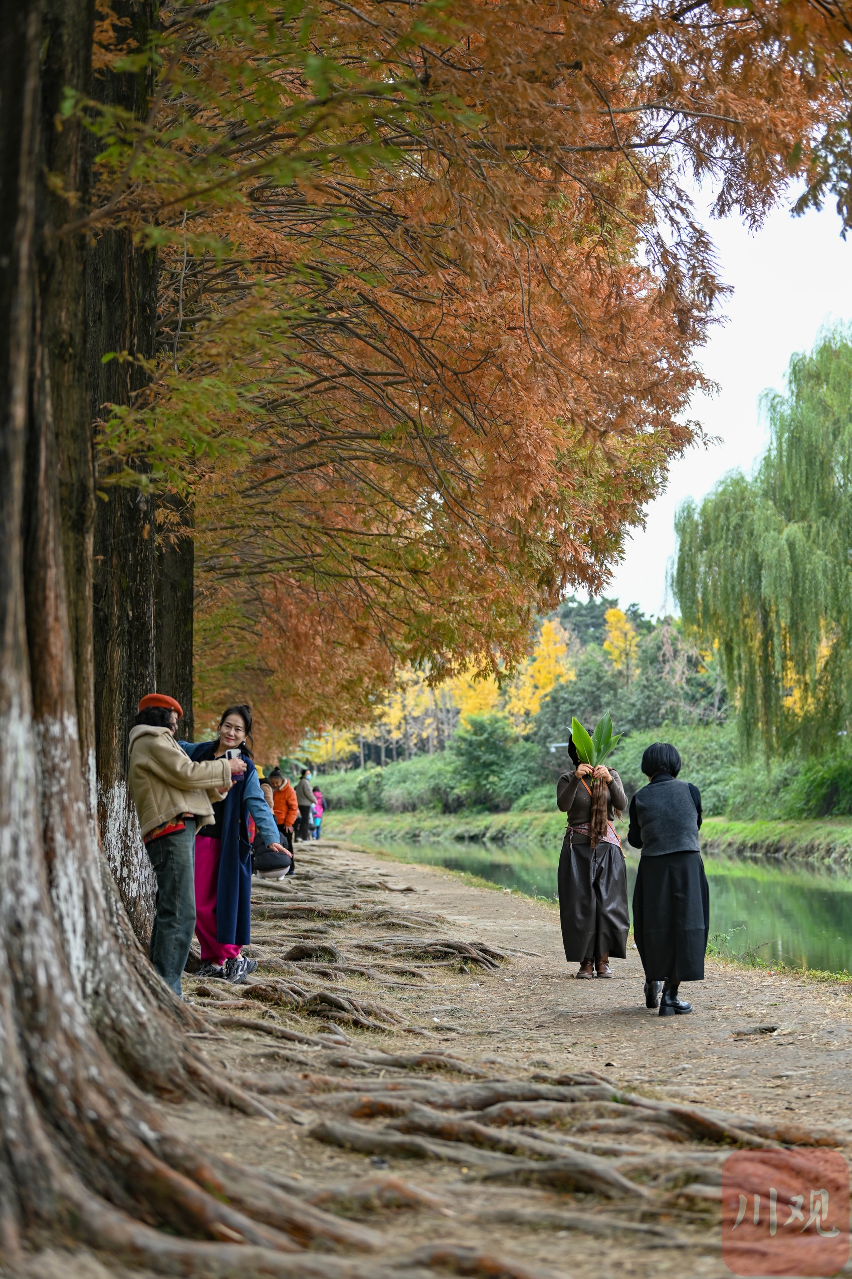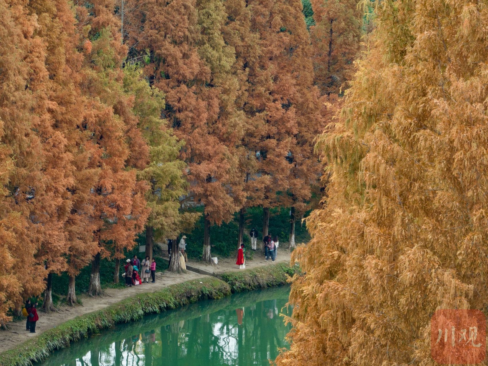 12月3日,成都升仙湖畔的水杉林进入最佳观赏期。绵延2公里的百余株水杉悄然换上 “红装”,橙红、浅黄与墨绿交织渐变,倒映在澄澈河面,宛如展开一幅浓墨重彩的冬日油画,吸引大批市民游客前来打卡。