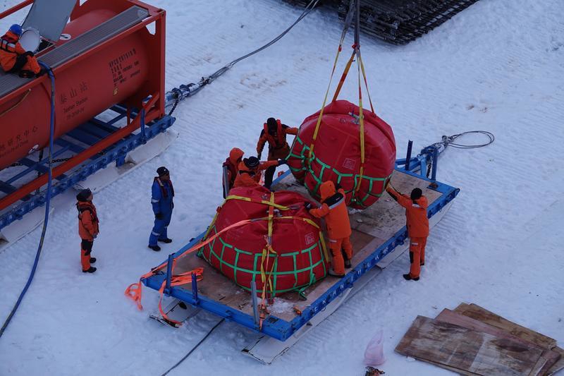 北京时间12月3日凌晨,工作人员在“雪龙2”号船侧冰面开展油囊装车作业。