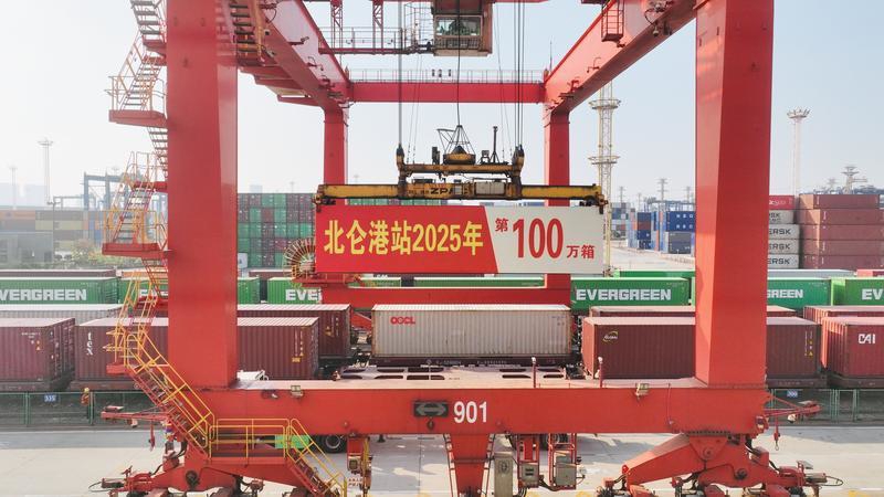 图为宁波舟山港北仑港站起吊今年第100万标准箱的作业场景。(宁波舟山港供图)