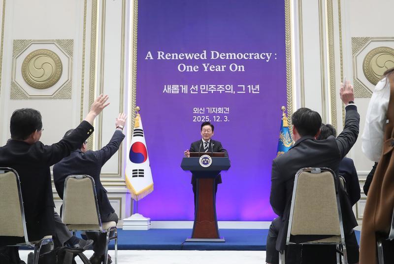 12月3日,在韩国首尔青瓦台迎宾馆,韩国总统李在明举行外媒记者会。