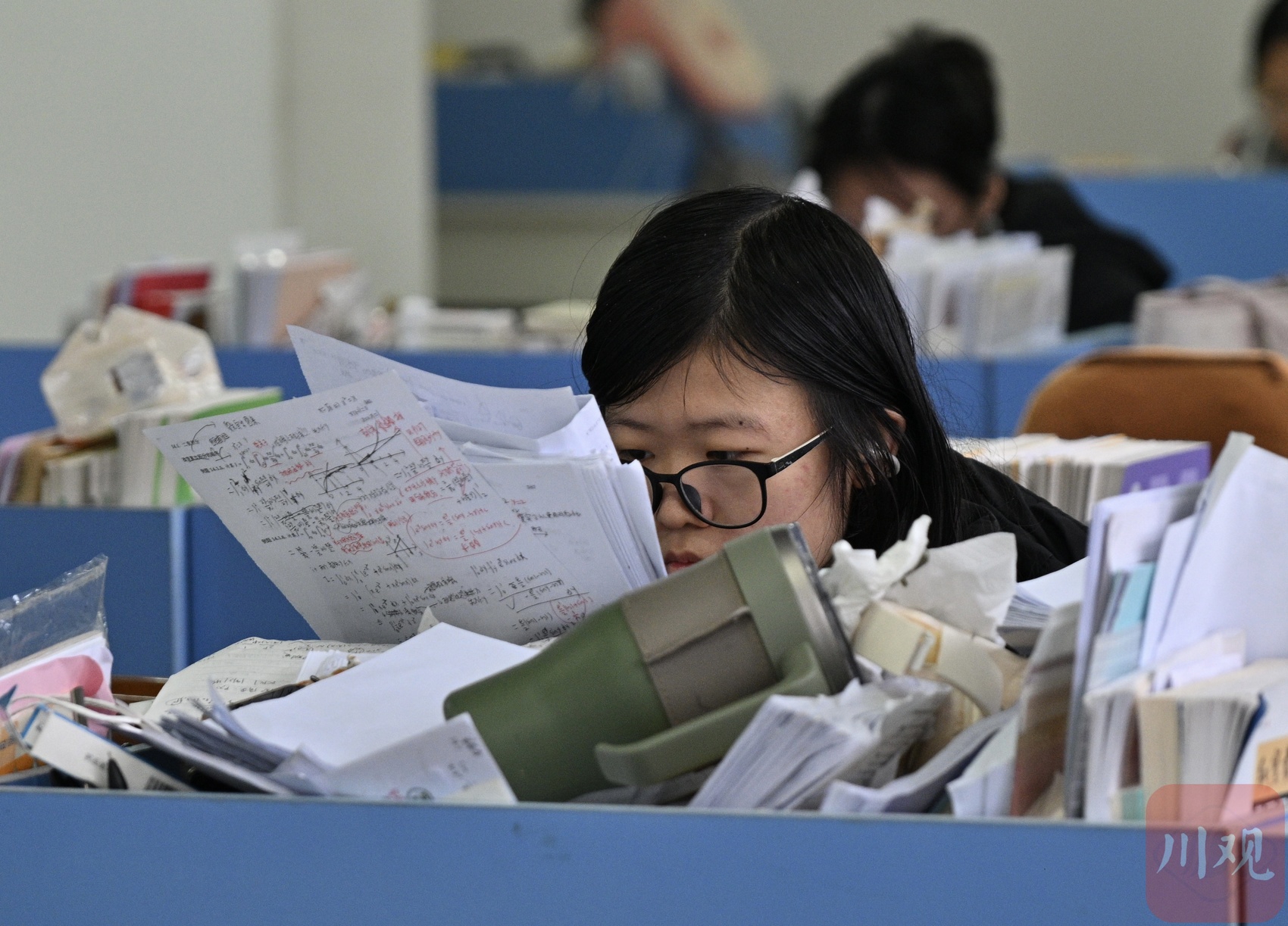 图书馆内座无虚席,走廊里也挤满了备考学子。他们或倚墙默诵知识点,或低头标注复习资料,厚厚的参考书、大容量保温杯成为桌上“标配”。同学们紧盯书本,反复梳理巩固考点,笔尖划过纸张的沙沙声、书页翻动的窸窣声,共同构成了冲刺阶段的奋进旋律。