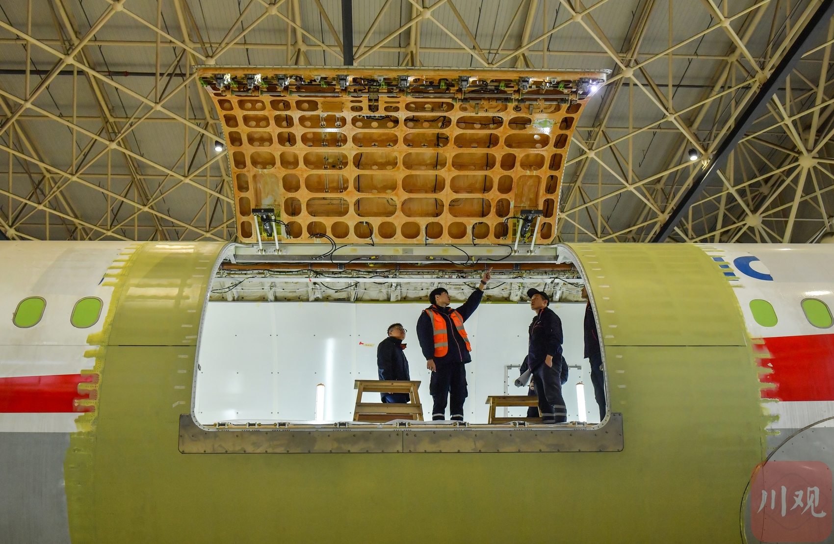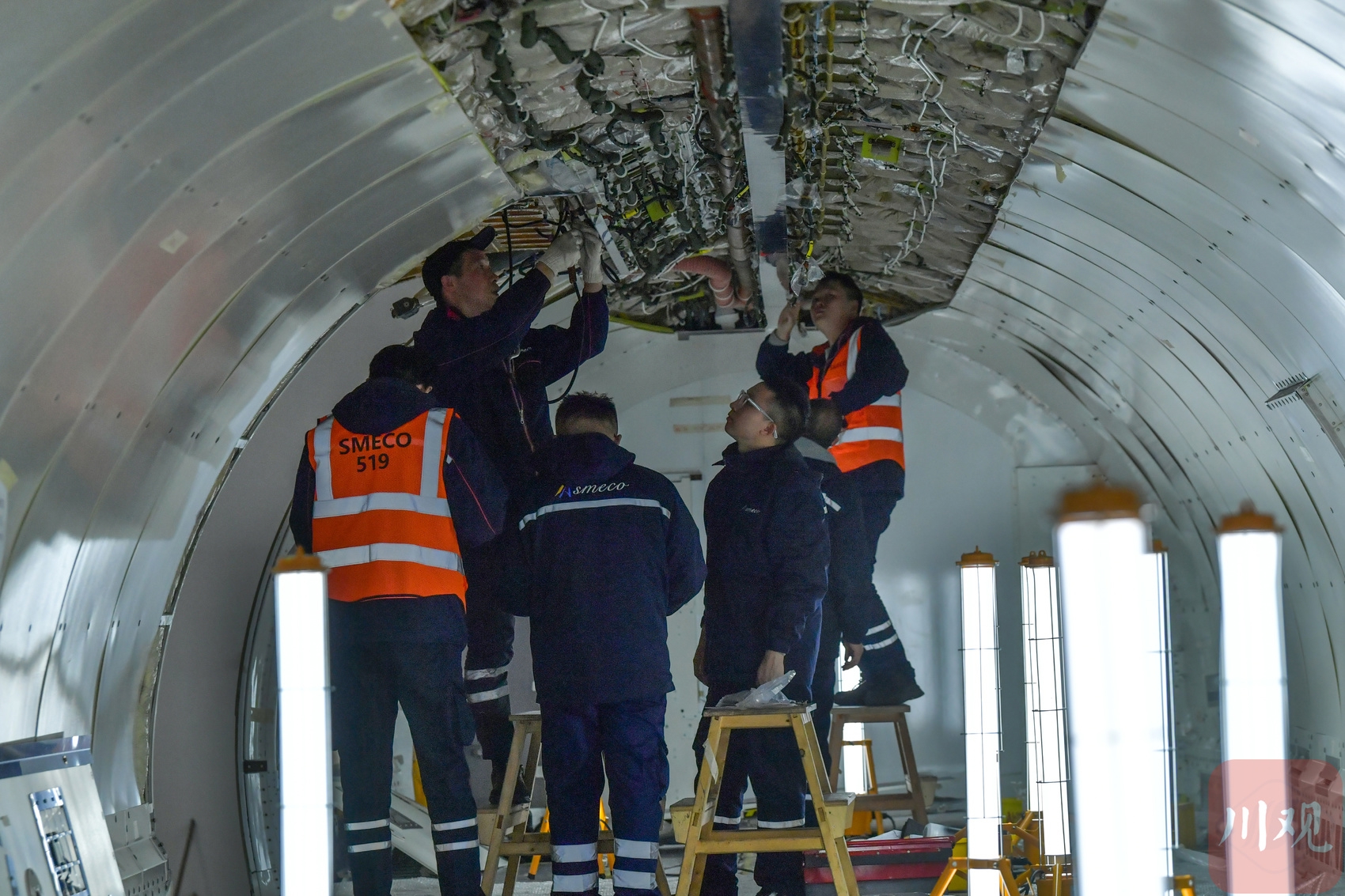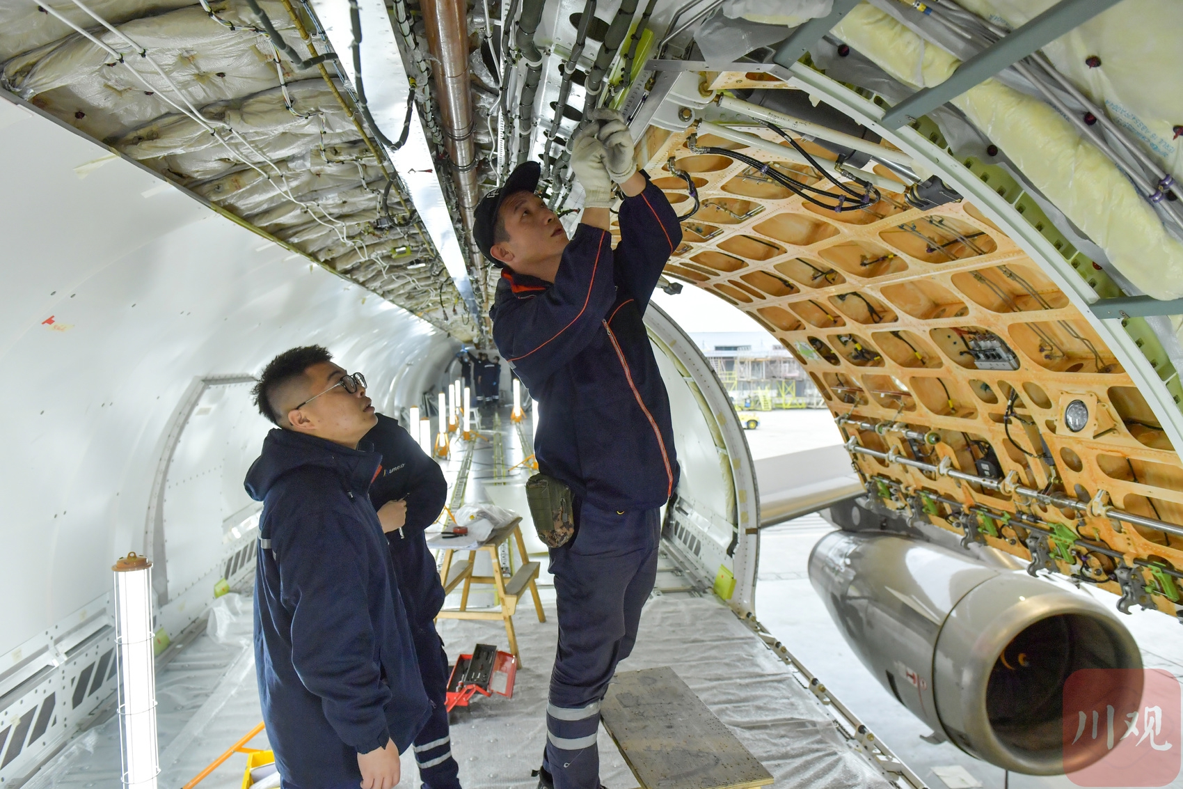 2025年12月3日,位于成都双流国际机场的四川飞机维修工程有限公司(以下简称“川维公司”)机库内一片繁忙。十多名工程师正对一架空客A321客机进行“客改货”作业——安装侧壁板、调试货舱门……各项工序有序推进。