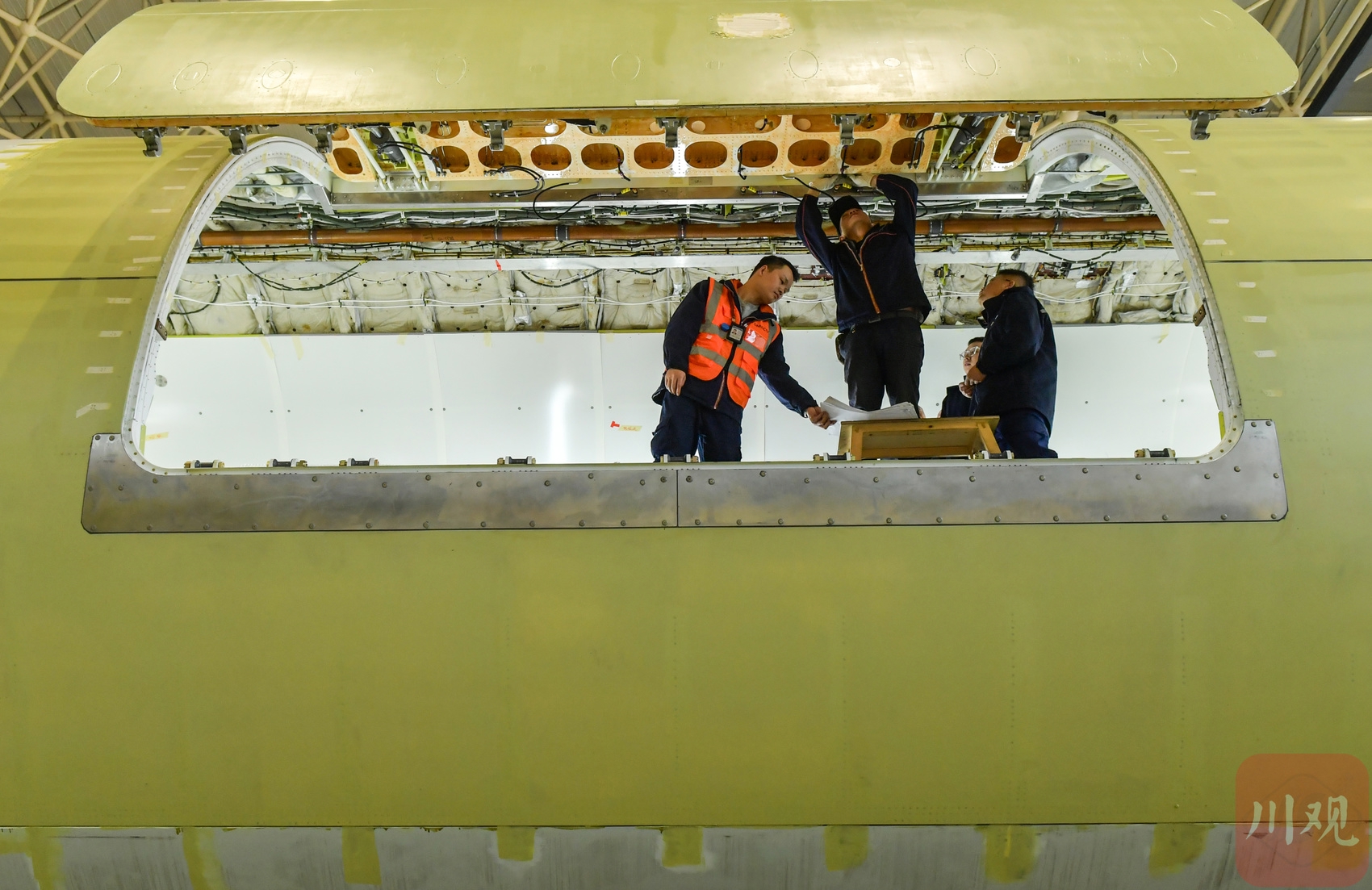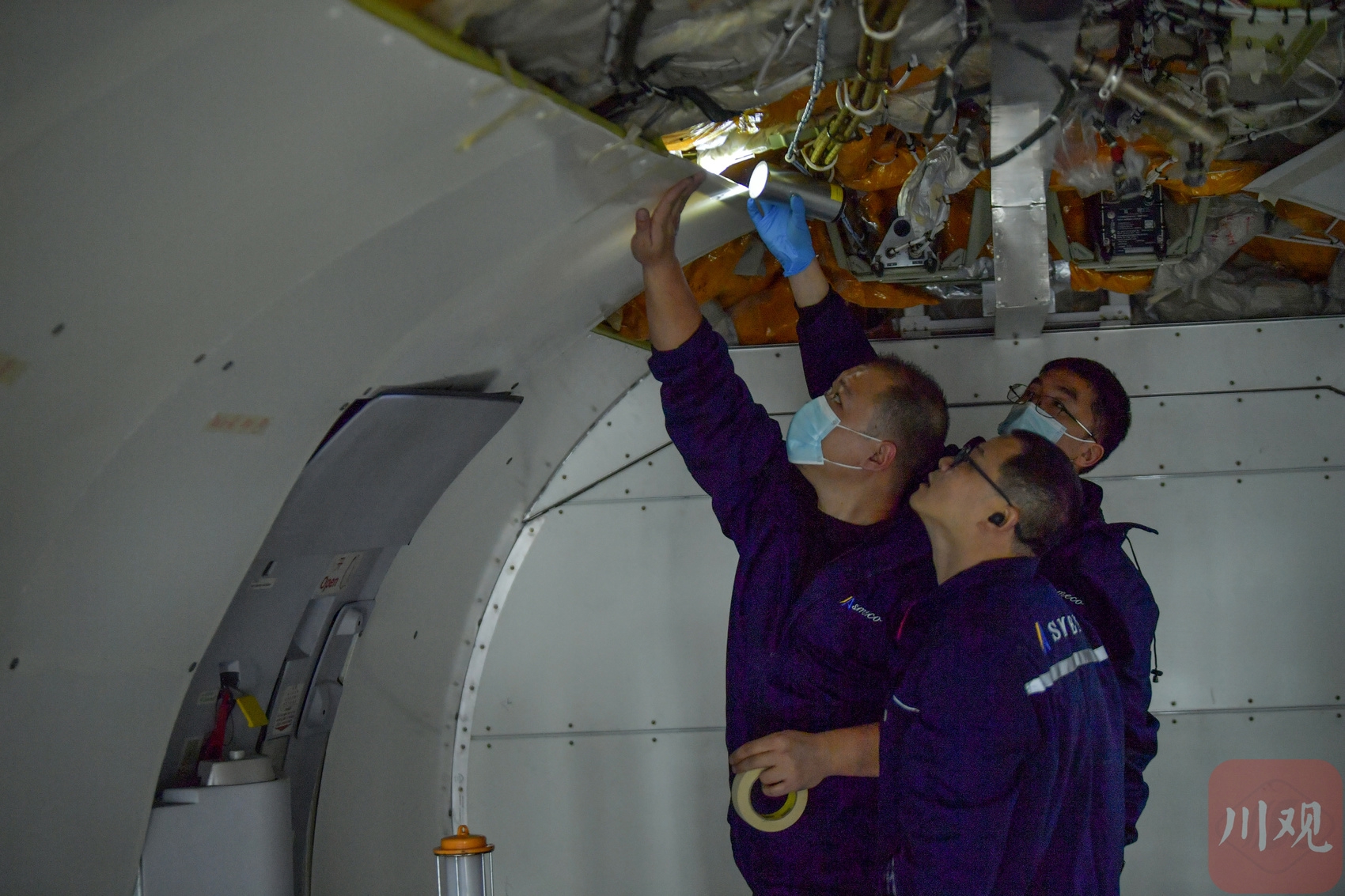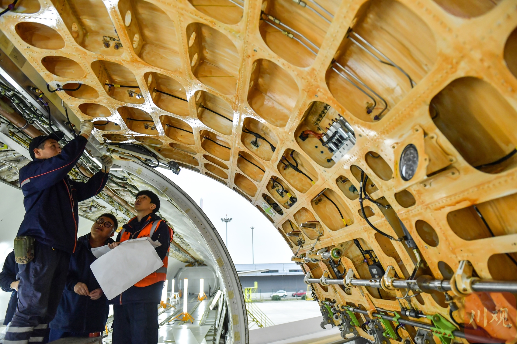 2025年12月3日,位于成都双流国际机场的四川飞机维修工程有限公司(以下简称“川维公司”)机库内一片繁忙。十多名工程师正对一架空客A321客机进行“客改货”作业——安装侧壁板、调试货舱门……各项工序有序推进。