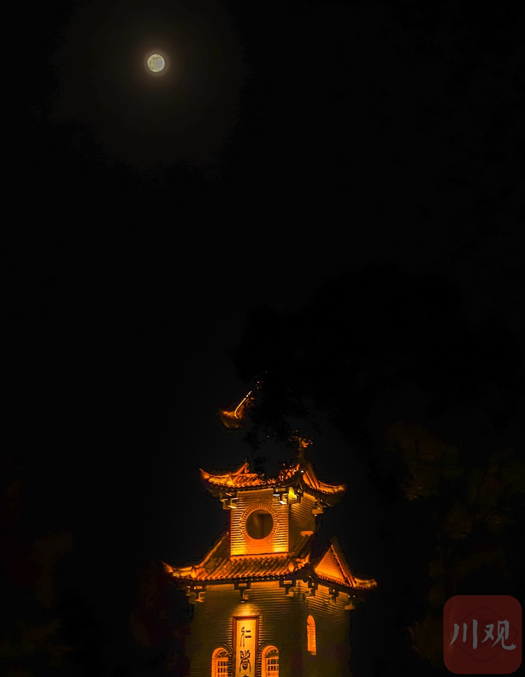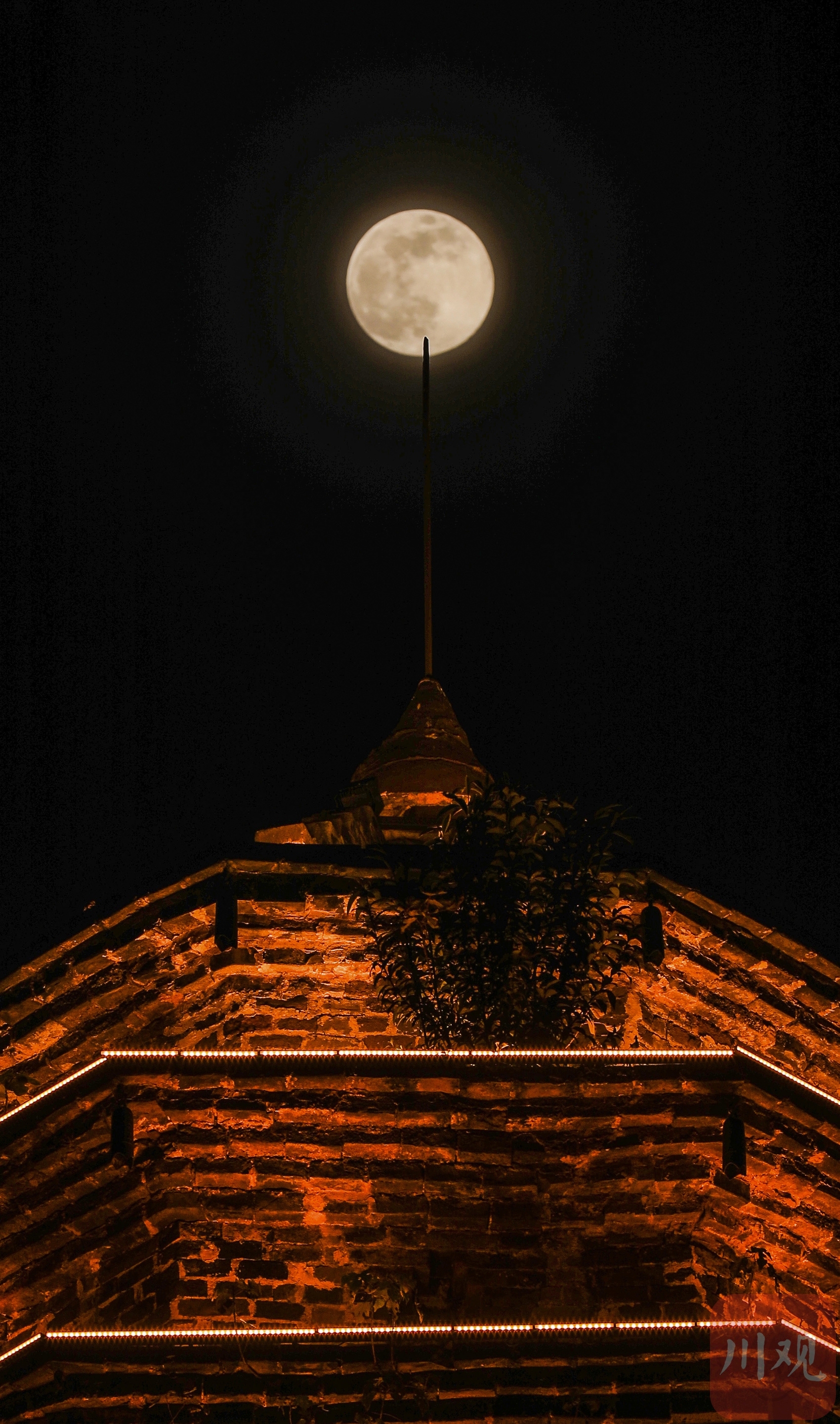 12月4日,在成都大邑县安仁中国博物馆小镇“仁者安仁”古塔,定格“超级月亮”。C视觉签约摄影师 黄加荣