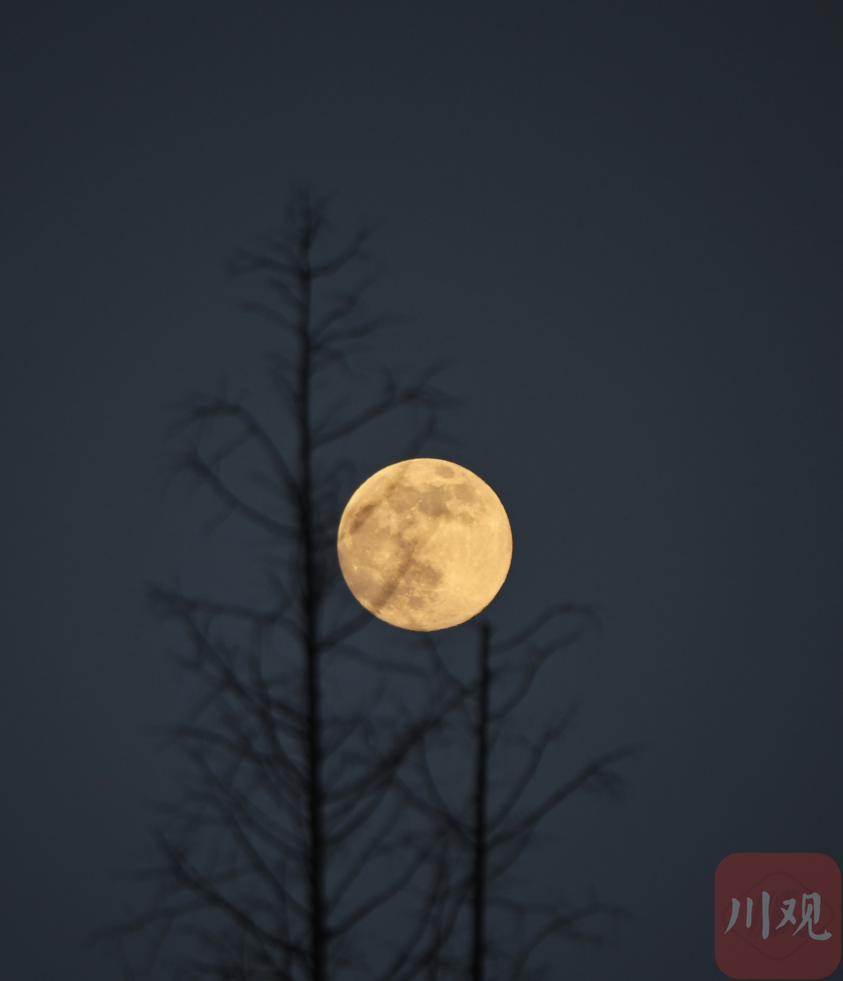 12月4日,在成都双流东升街头,“超级大月亮”高悬树梢。C视觉签约摄影师 钟树军