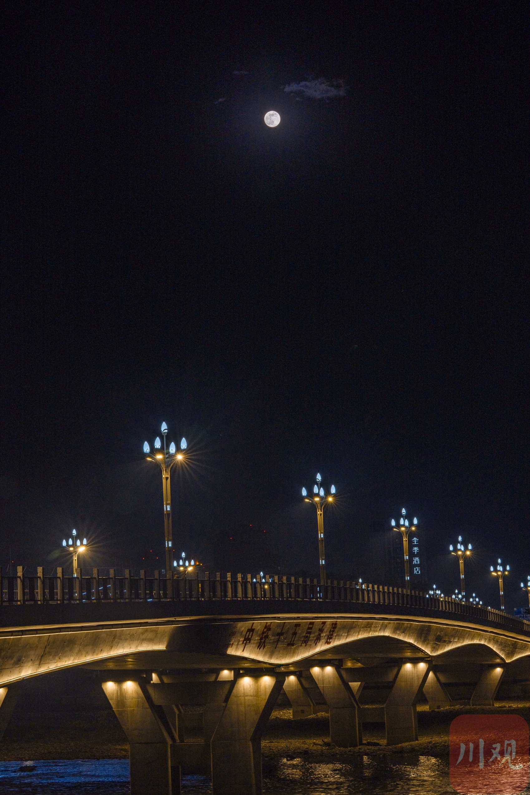 12月4日,“超级月亮”从文井江崇州大桥上空缓缓升起。C视觉签约摄影师 李旭