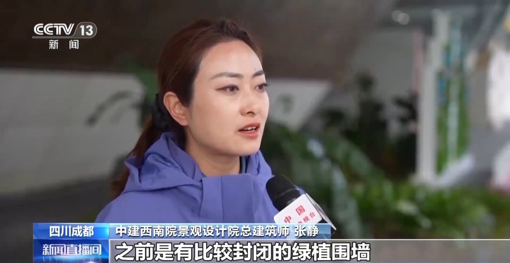 中建西南院景观设计院总建筑师 张静:之前有比较封闭的绿植围墙,周边前区公共空间也是受到市政道路限制。但是改造过后,释放了更多的公共共享空间,给市民打造成了一体化的街区即公园的、舒适的公园城市会客厅。