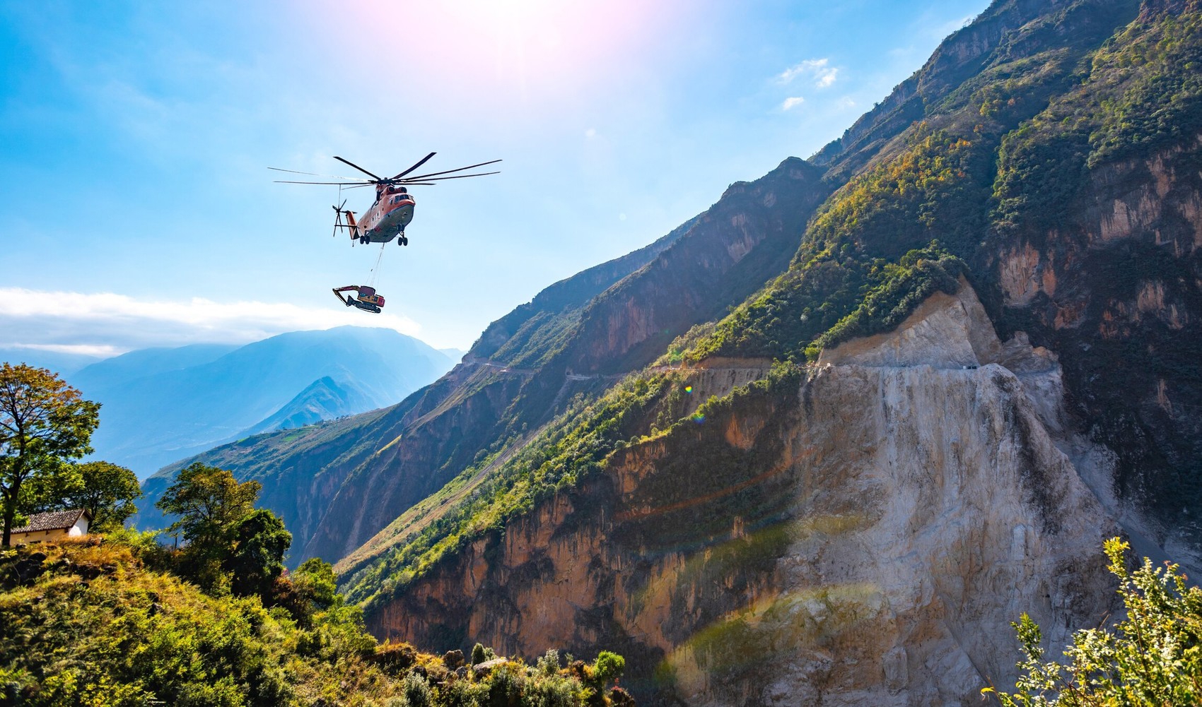 阿布洛哈通村公路建设期间,用直升机调运修路设备