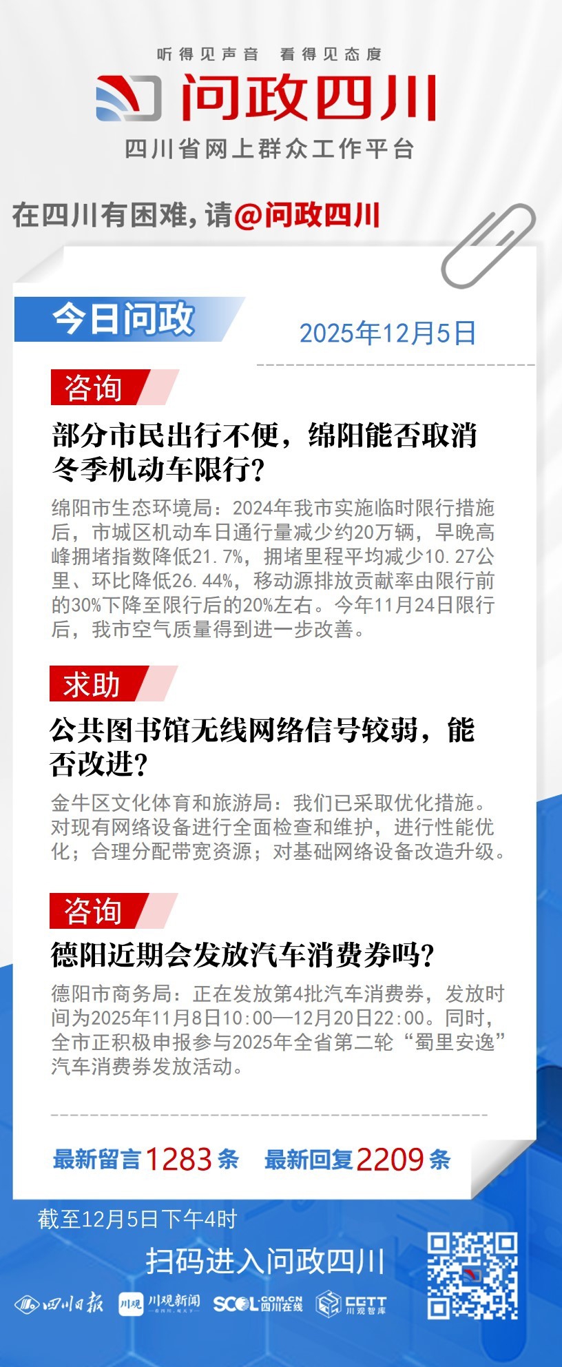 问政四川网友提问:绵阳冬季机动车限行政策实施一年,影响了部分市民出行,公共交通也需完善。绵阳能否取消冬季机动车限行?