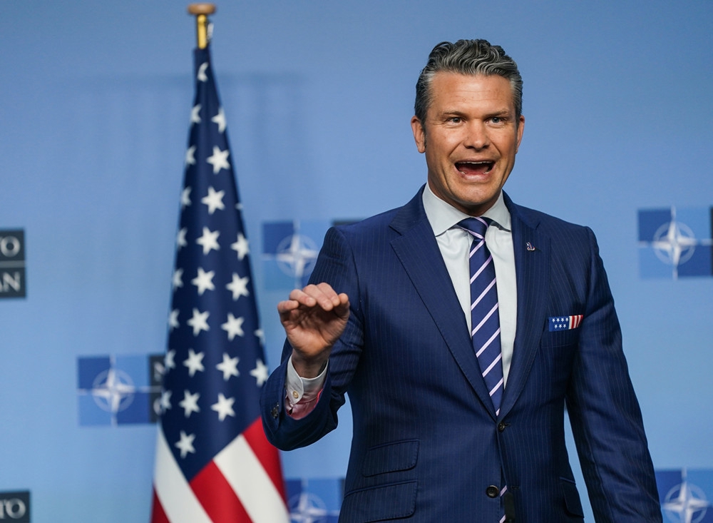 10月15日,在比利时布鲁塞尔,美国国防部长赫格塞思在记者会上发言。图据新华社