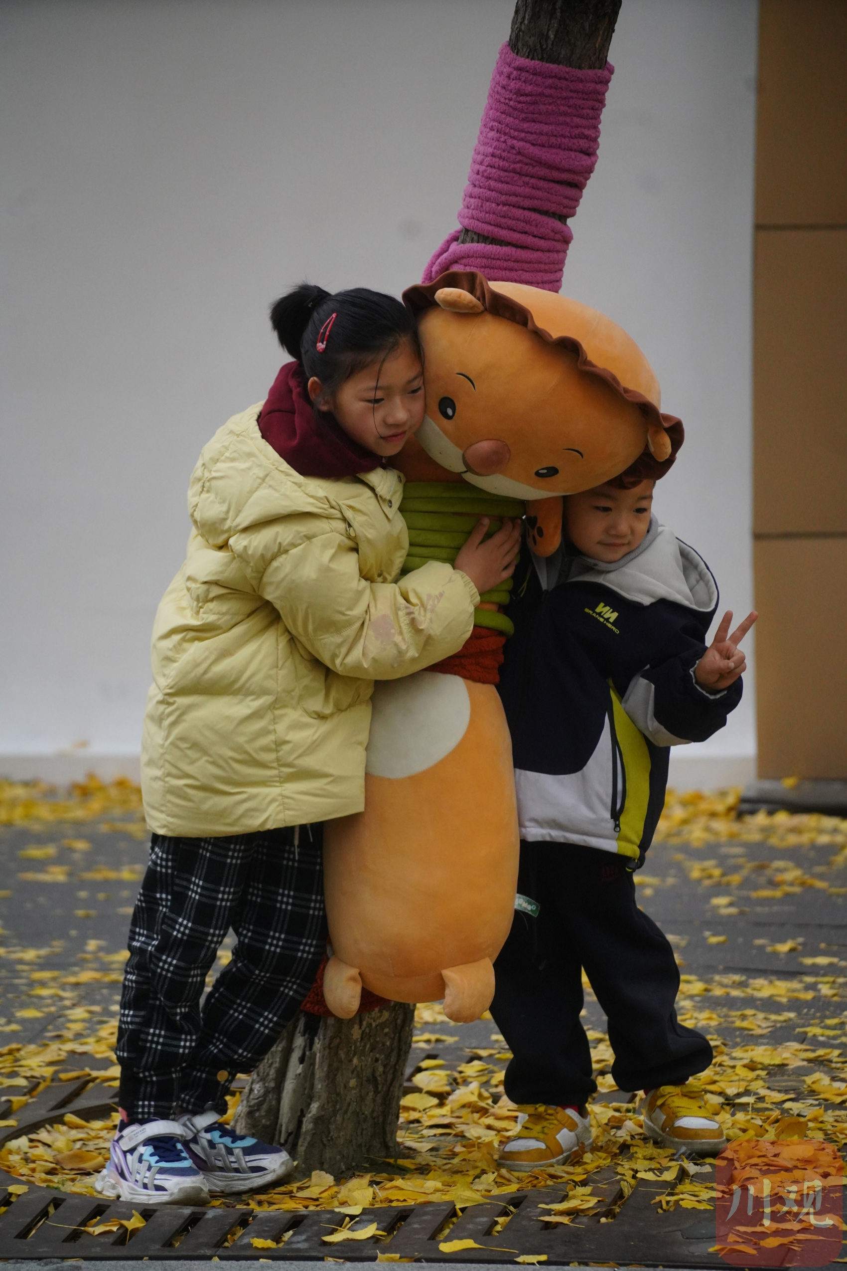 锦绣街,两个小朋友在“抱抱树”前玩耍