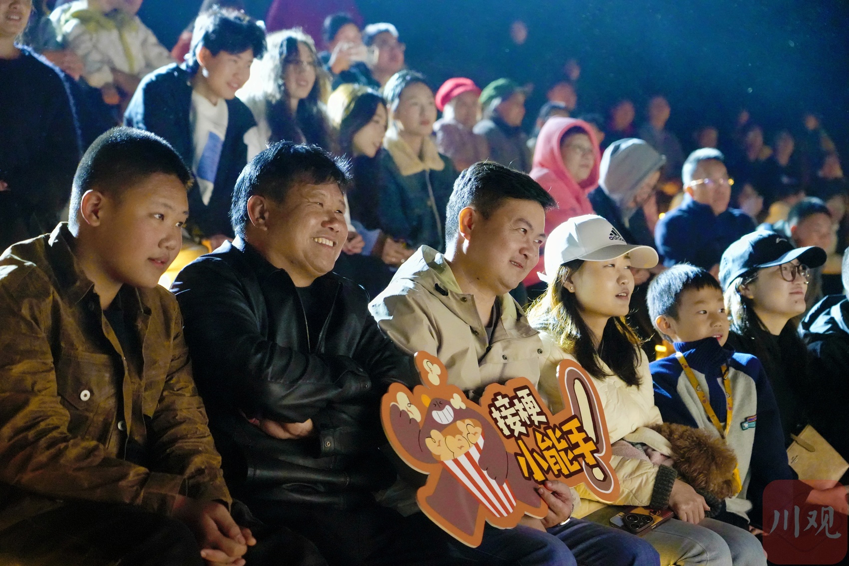 于是,聚光灯亮起。紧靠着田埂,一个临时的小舞台搭建起来,异木棉树上,挂满暖黄色的小灯。小板凳、竹椅围成半圆,坐满了人:拿着玩具的孩子窃语着,拄着拐杖的老人倾听着,中年汉子裤脚还沾着泥,几个年轻人举着手机录像,屏幕的光映亮了他们笑弯的眼睛。
