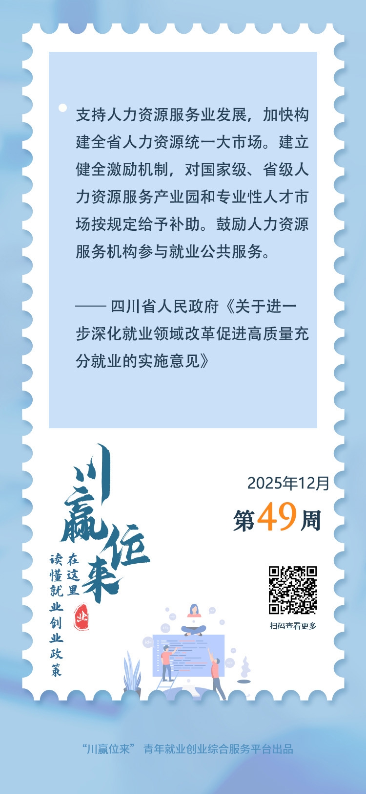 “四川将加快构建全省人力资源统一大市场,鼓励人力资源服务机构参与就业公共服务。”四川省人民政府近日印发的《关于进一步深化就业领域改革促进高质量充分就业的实施意见》明确提出,要发挥专业化人力资源服务促就业作用,建立健全激励机制,对国家级、省级人力资源服务产业园和专业性人才市场按规定给予补助。