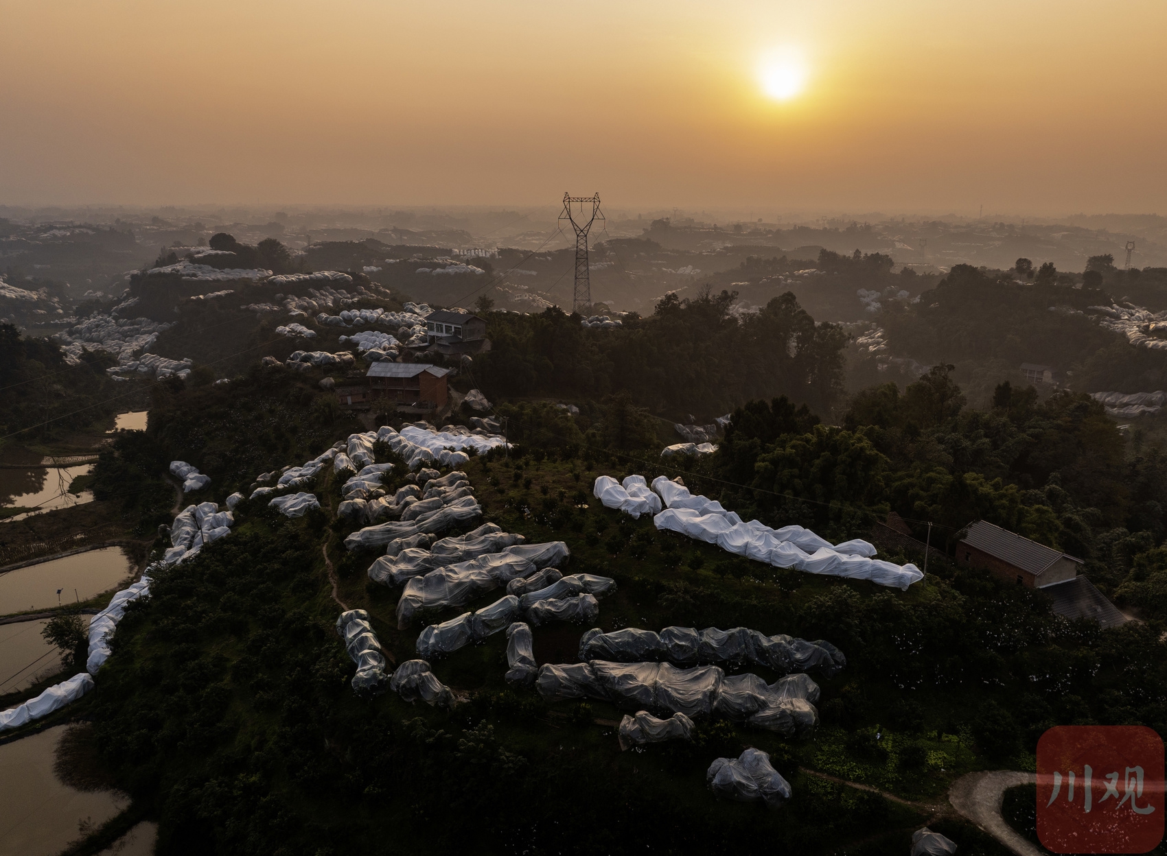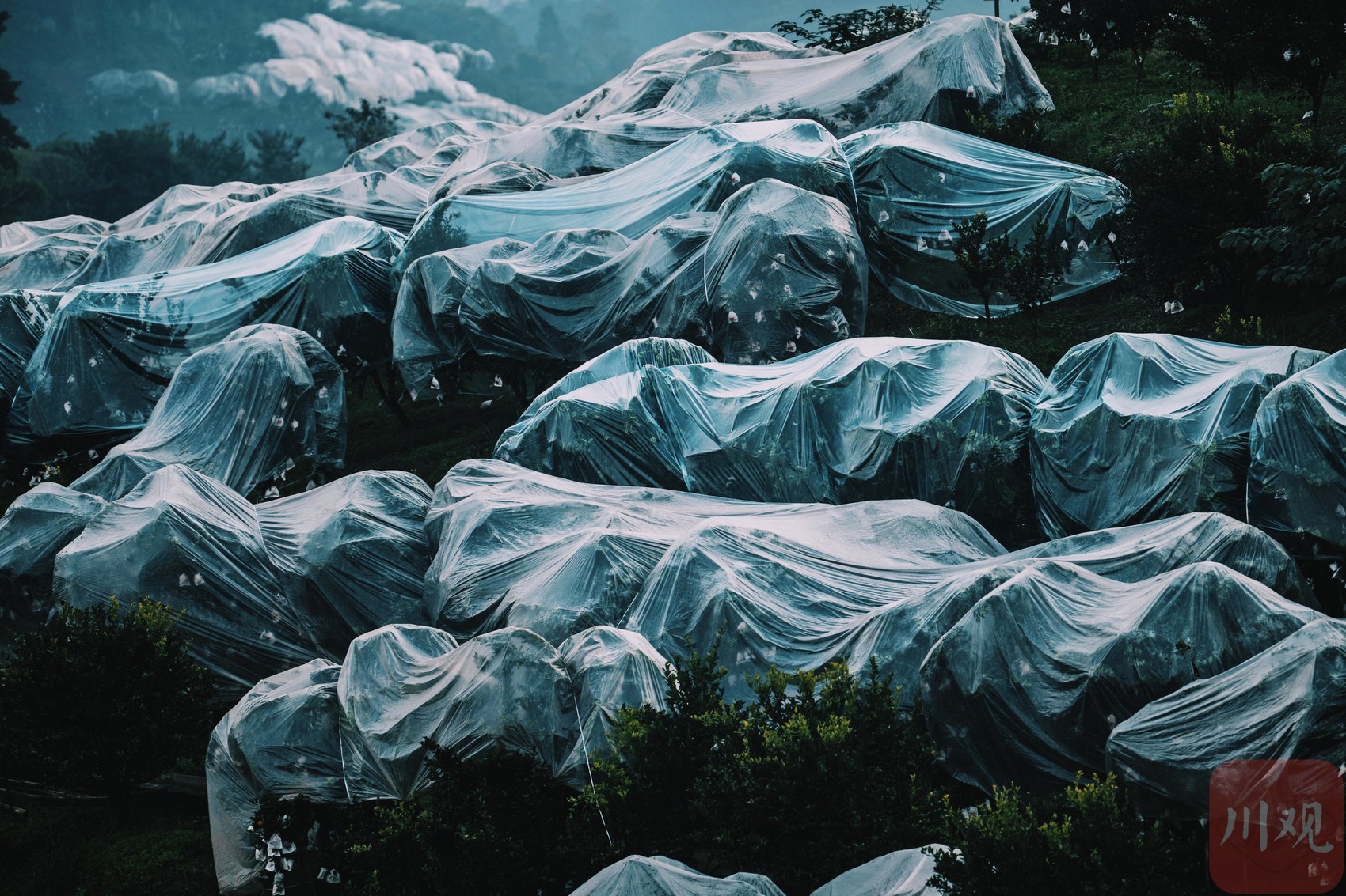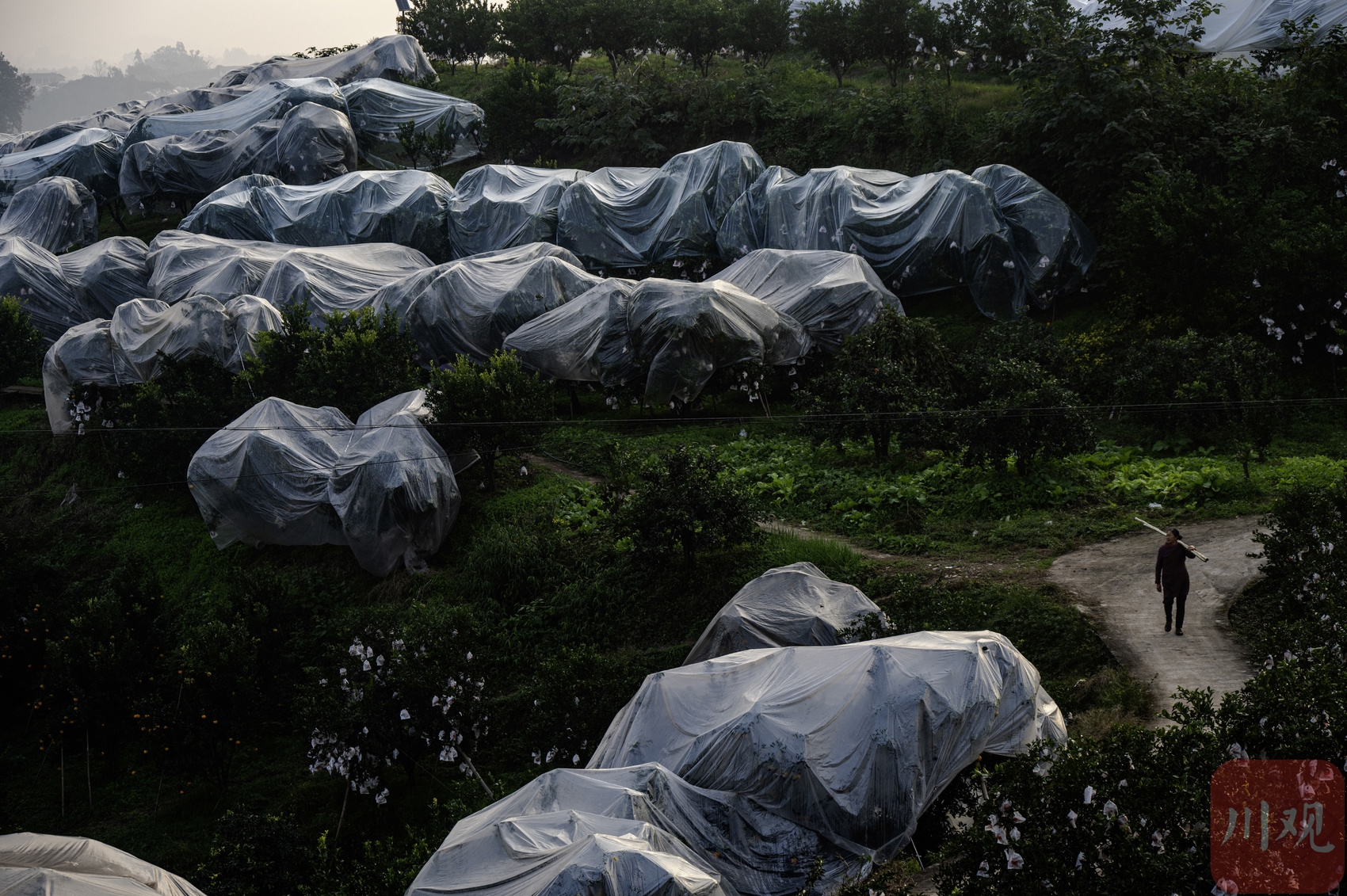 12月7日,自贡市荣县留佳镇小田村的果园里一派繁忙景象。果农们手托薄膜,熟练地为柑橘树进行覆膜防护。轻薄的覆膜如纱似雾,轻轻覆盖在树冠之上,宛如为果树披上了一身洁白的纱衣。