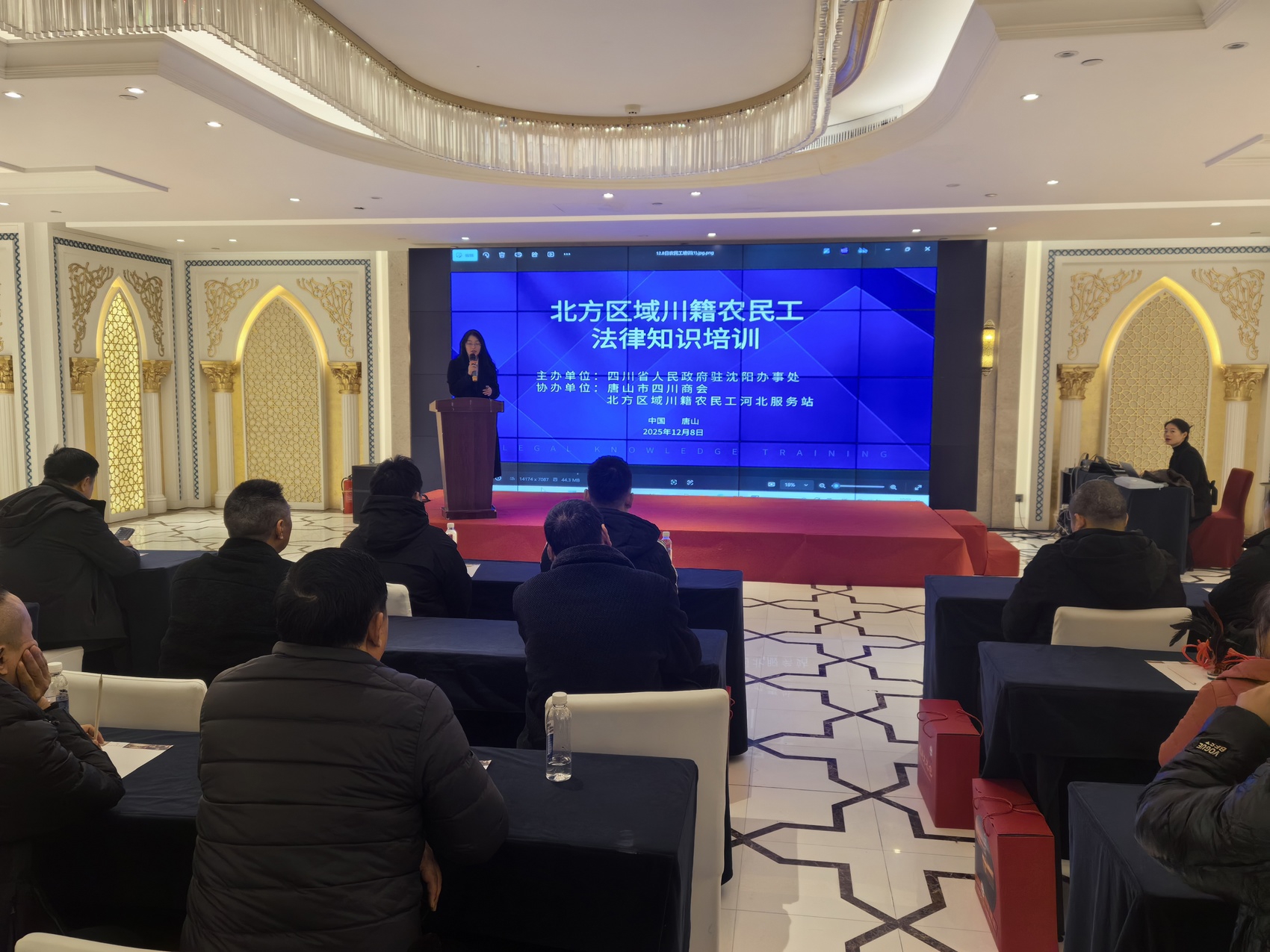 12月8日,由四川省人民政府驻沈阳办事处联合唐山市四川商会、北方区域川籍农民工河北服务站开展的“北方区域川籍农民工法律知识培训”在唐山市举行。活动以“办实事、解难题、送温暖、讲法律”为主题,通过法律知识培训、送慰问礼包、文体活动等形式,为60余名川籍农民工代表送上来自家乡的关怀和温暖。