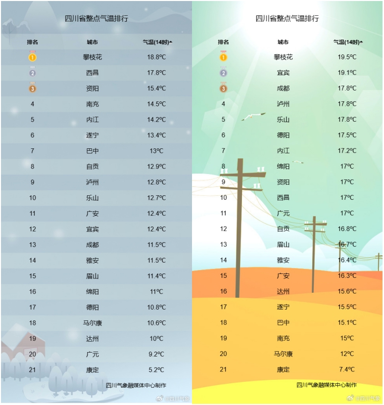 四川各城市2025年12月8日(左)与12月7日(右)14时实况气温对比图