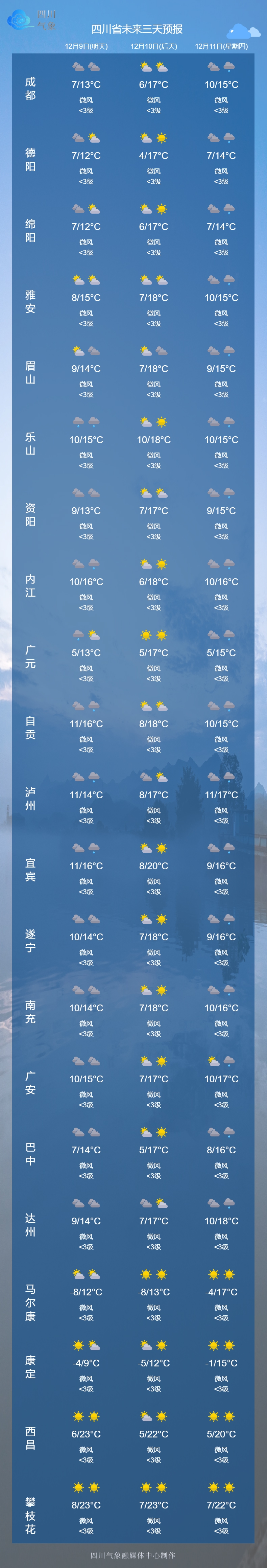 中央气象台预计,今天(12月8日)夜间至11日白天,四川盆地中西部部分地区有轻度霾。