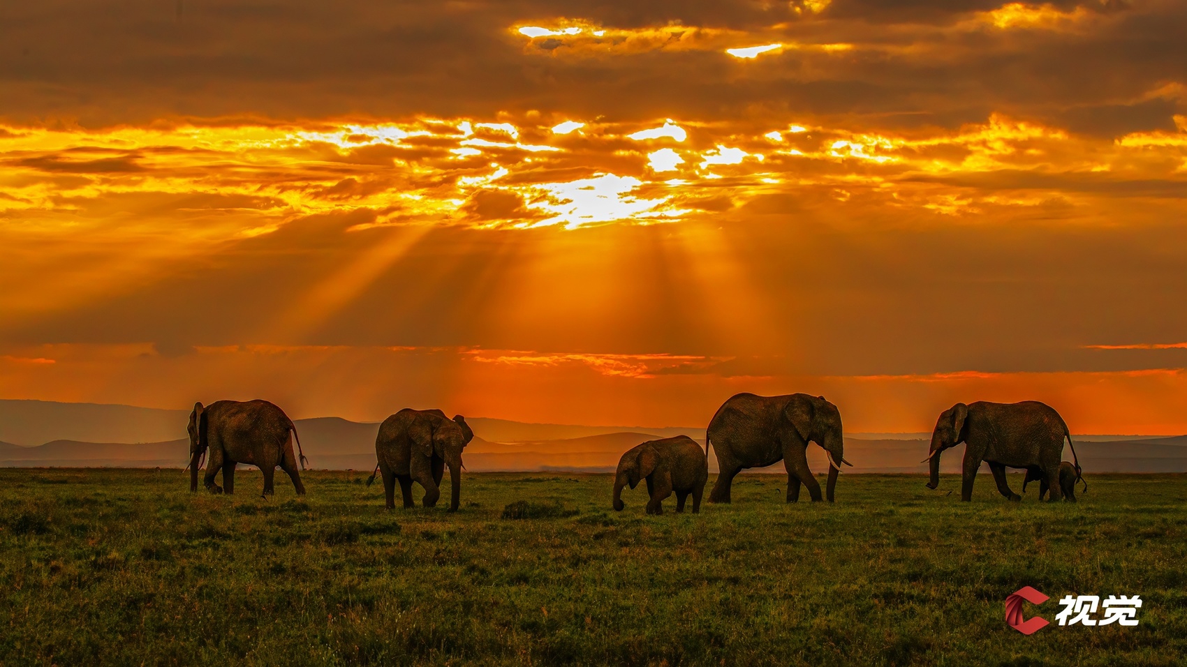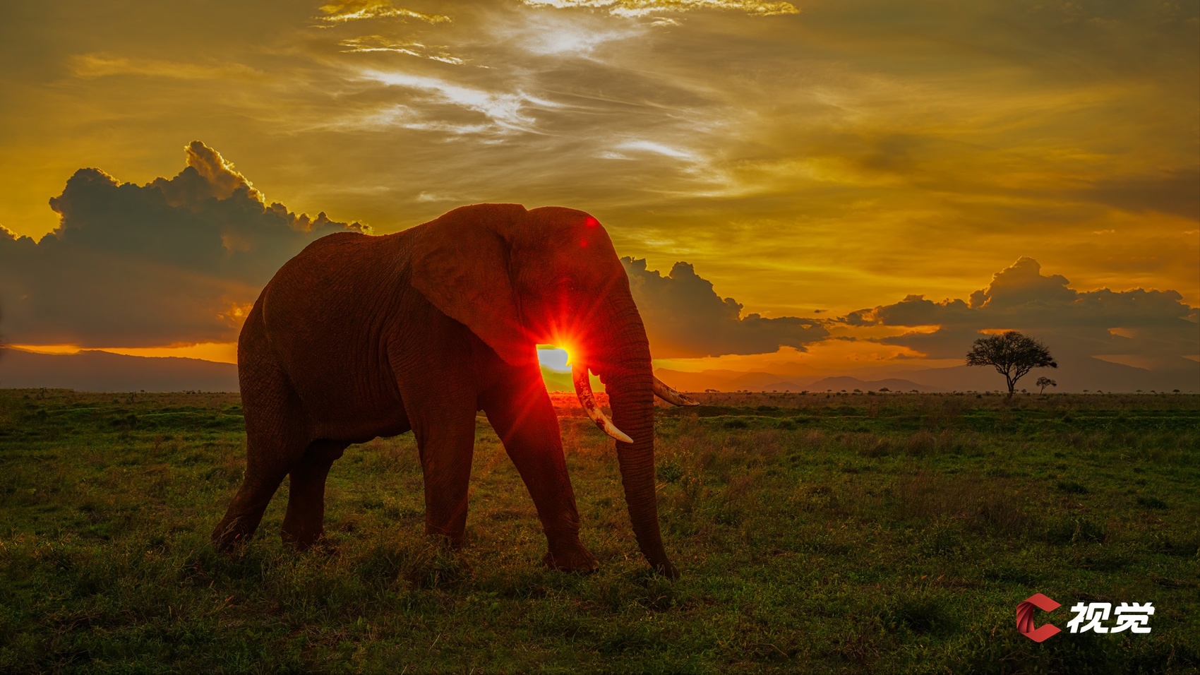 核心亮点:红土旷野上的“赤金行者”非洲草原象,落日剪影与生态保护场景交融。