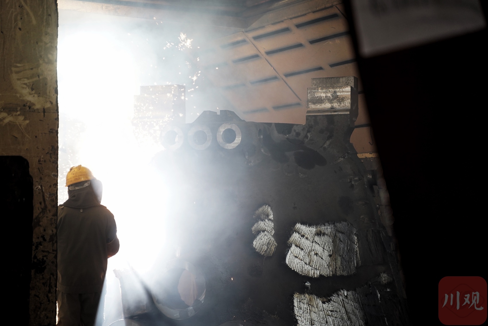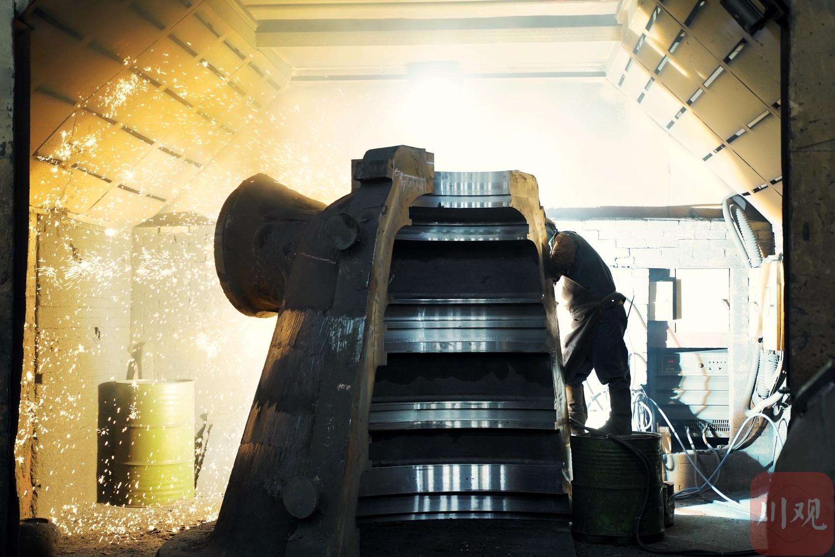 12月3日,四川省金镭重工有限公司(以下简称“金镭重工”)厂区内,机械轰鸣声与钢材焊接的“滋滋”声此起彼伏,车间里“工业风”氛围感拉满:在冷却区域,一个个巨型铸钢件黑里透红,数米之外传来阵阵热浪;在打磨车间,工人们围绕着形状不同、大小不一的铸钢件进行精细打磨,去除表面的瑕疵。