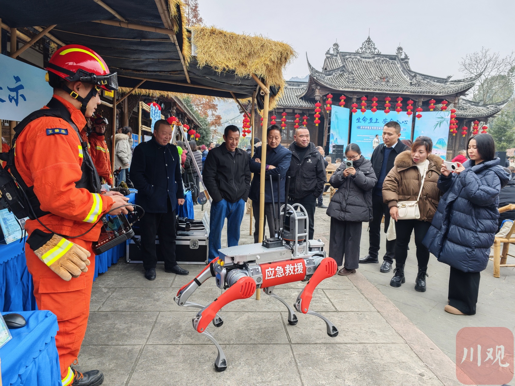 市民们围观机器狗通过摄像头和气体检测“天线”作业。