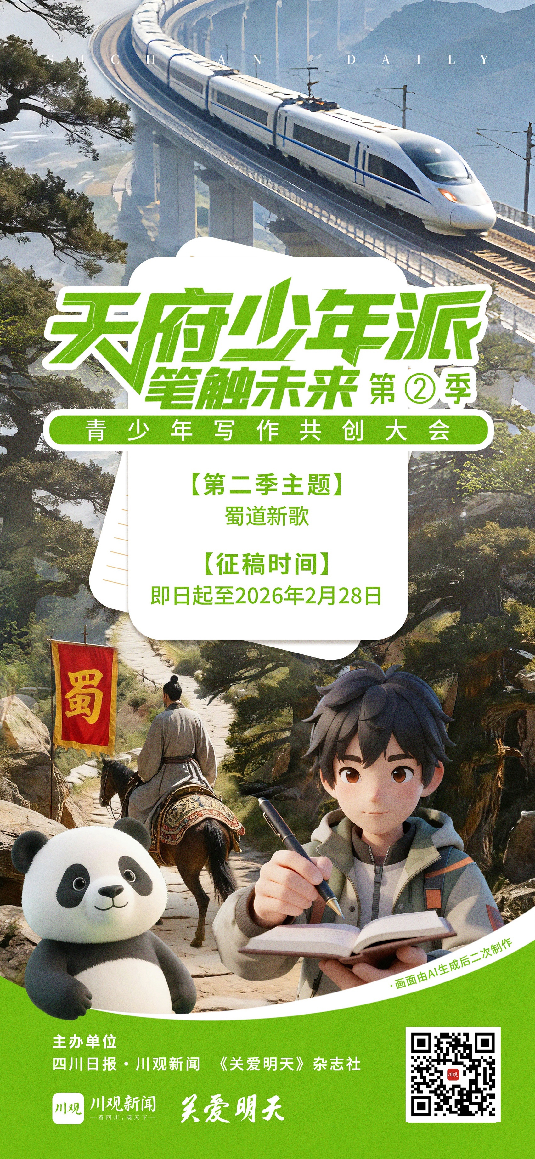 “天府少年派·笔触未来”青少年写作共创大会第一季收获了海量优秀作品,得到了学校、家长及社会各界的广泛认可。第二季写作共创大会以“蜀道新歌”为创作主题,持续深化“以写作为载体,传承文化、赋能成长”的核心理念,将承载着勇气、智慧与开放精神的文明之路,化作青少年笔下的创作沃土,为全国青少年搭建起书写传承、畅想未来的舞台。