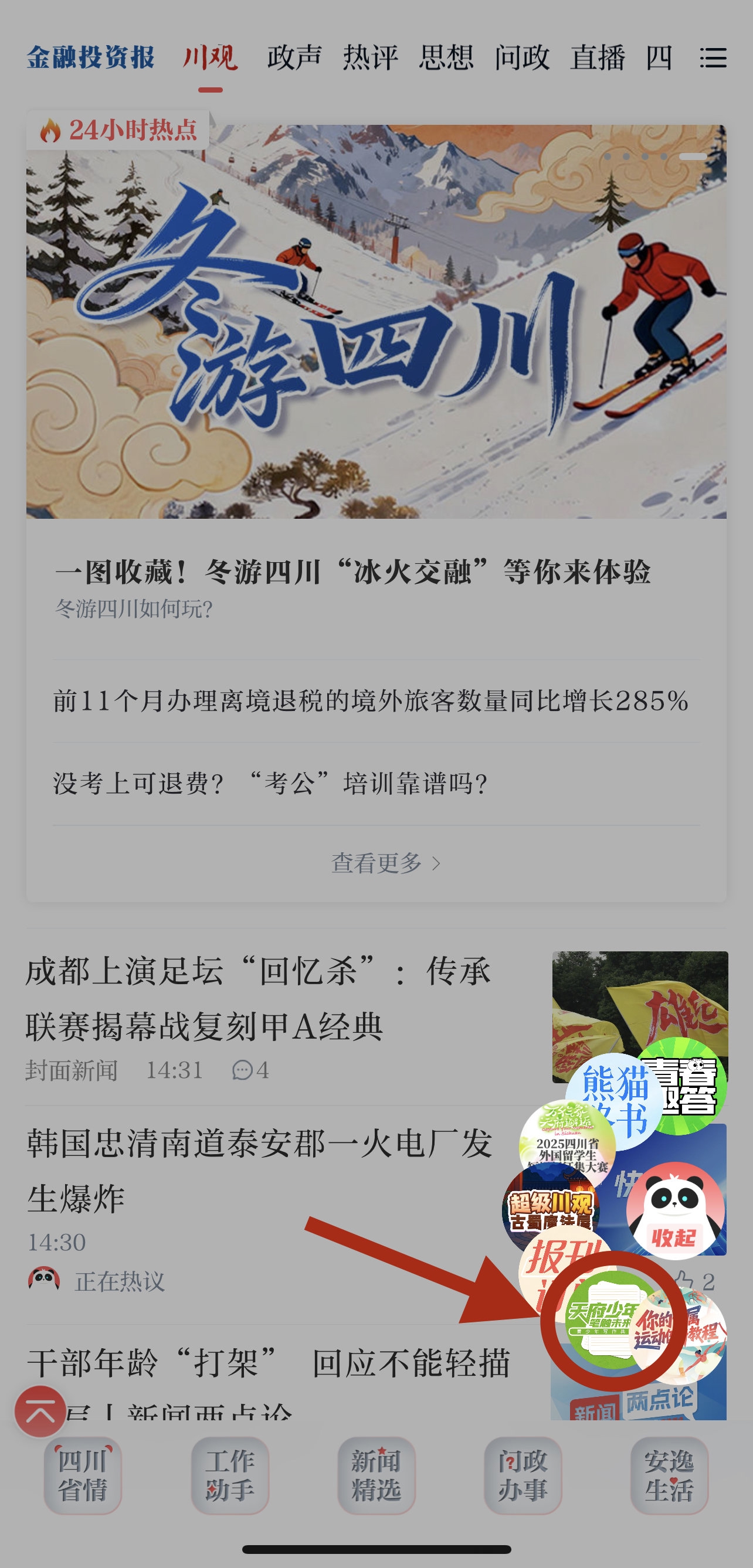 方式一:在川观新闻首页,点击右下方悬浮球,找到“天府少年派”活动图片点击参与;