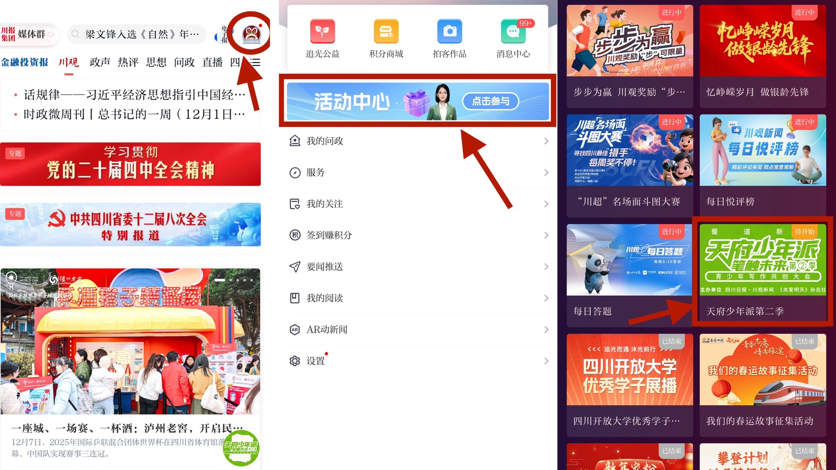 方式二:在川观新闻首页,点击右上角“我的头像”,进入“活动中心”,找到“天府少年派”活动图片点击参与。