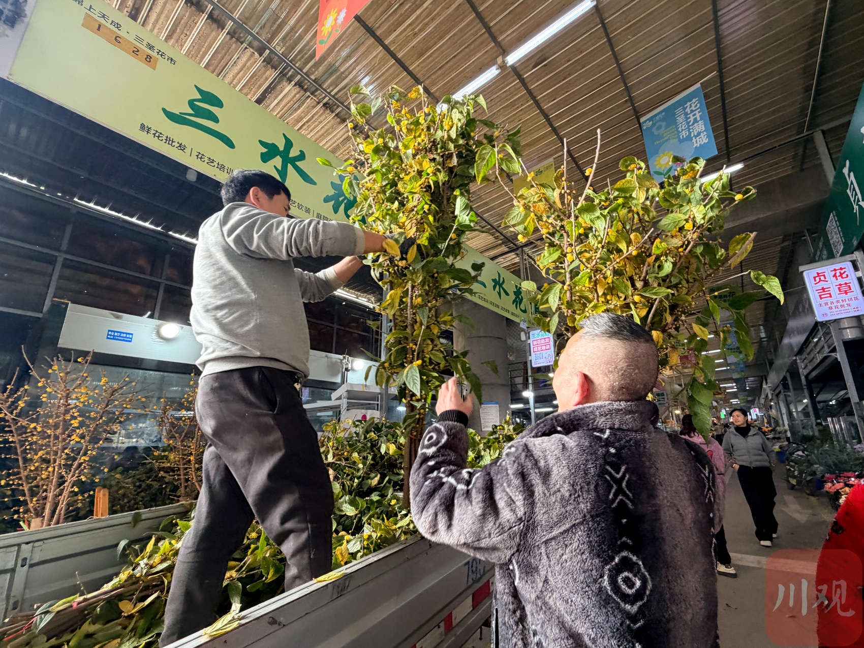 从基地通过货车拉到花店的蜡梅,代家祥正在下货。