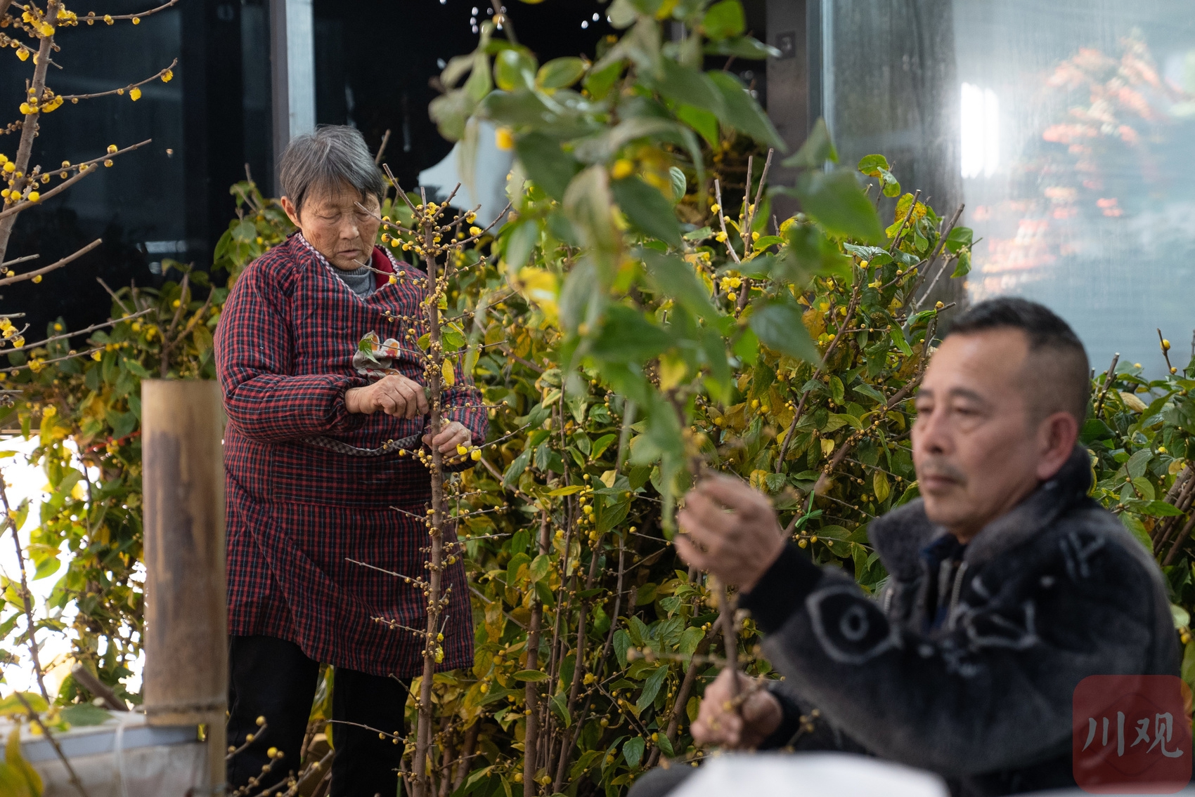 花店工作人员正在摘除蜡梅的叶子,在树枝上只保留花朵。