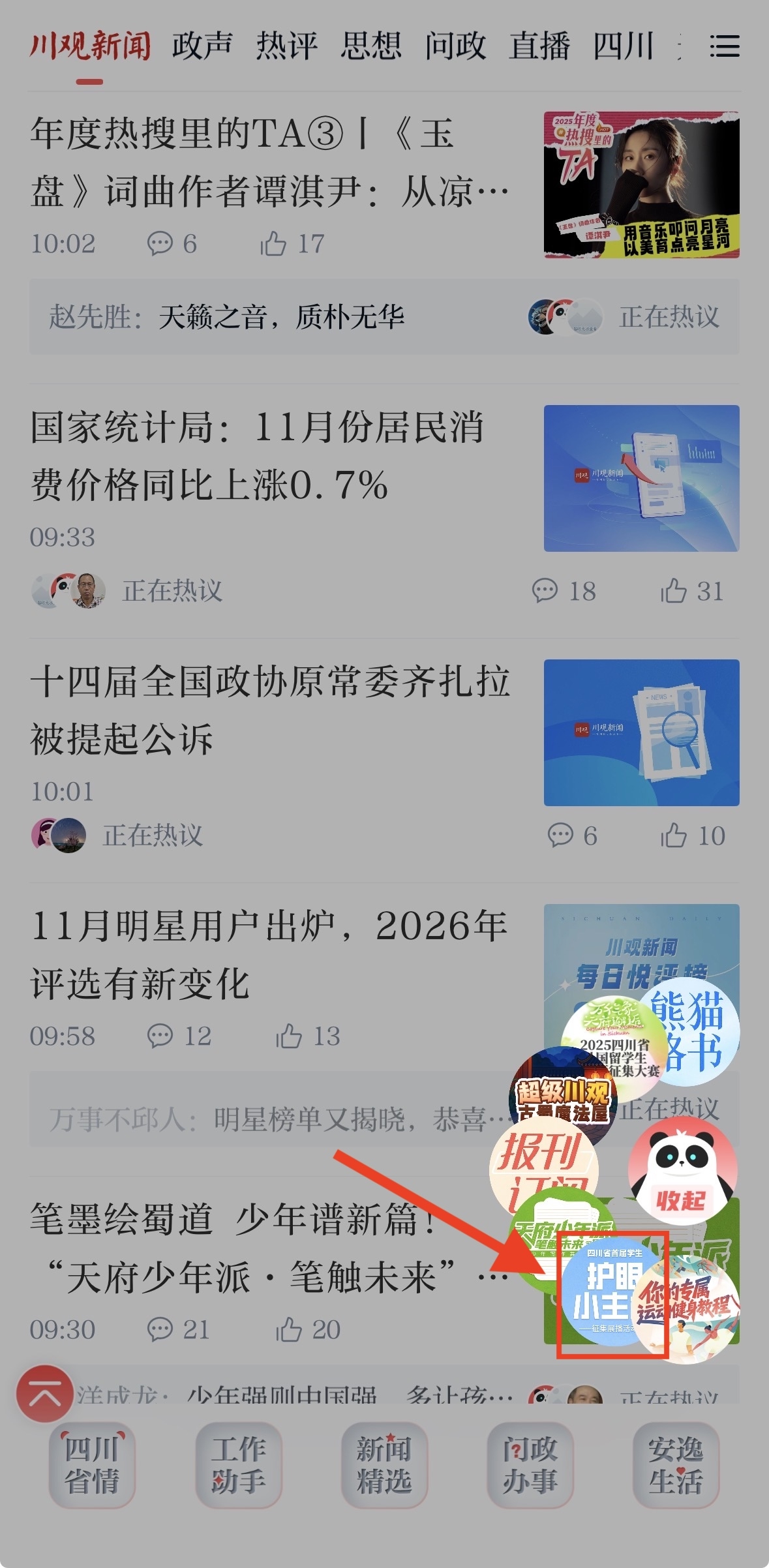 方式一:在川观新闻首页,点击右下方悬浮球,找到四川省首届学生“护眼小主播”征集展播活动图片,点击进入投稿;