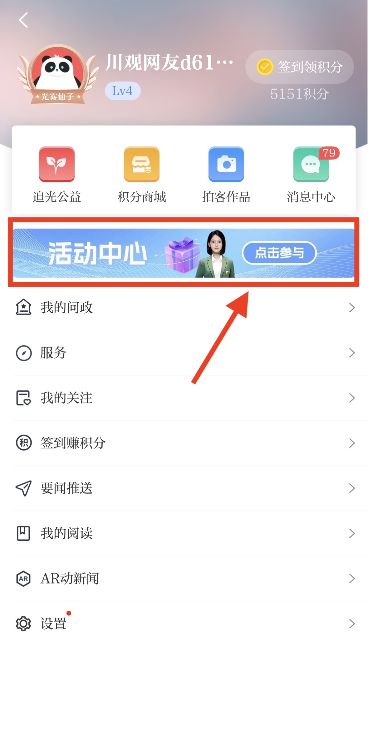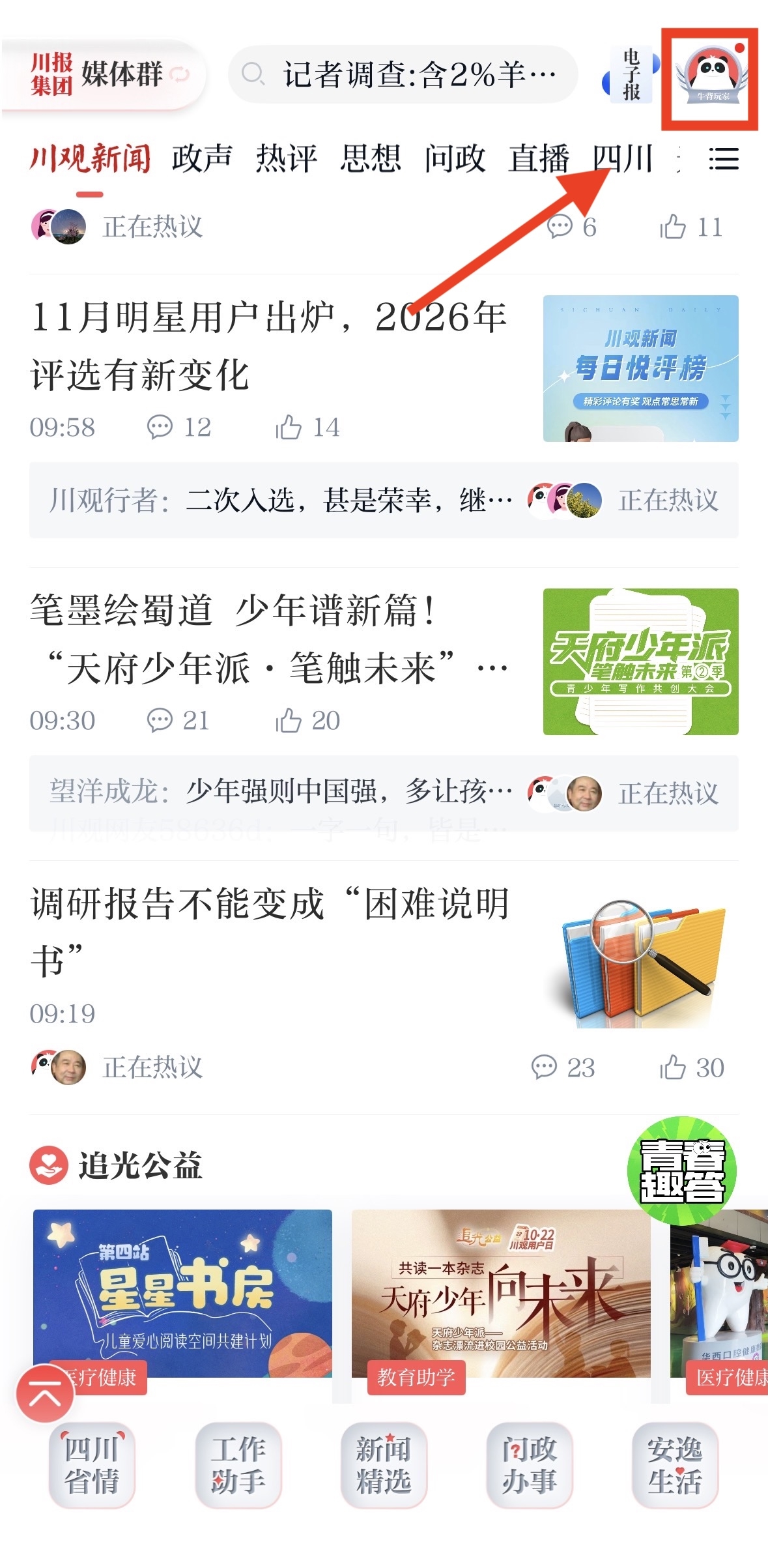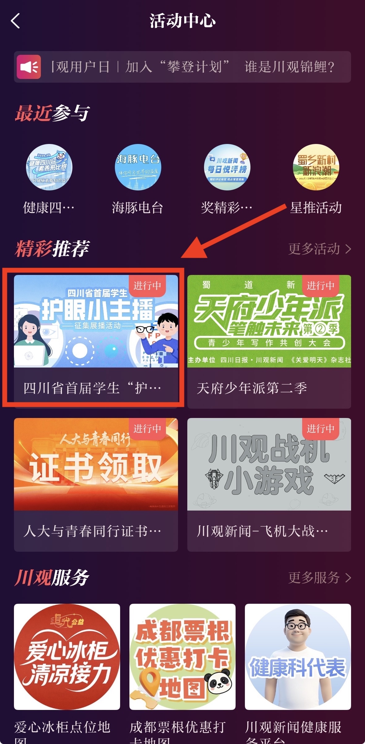 方式二:在川观新闻首页,点击右上角“我的”图标,再点击“活动中心”,找到四川省首届学生“护眼小主播”征集展播活动图片,点击进入投稿。
