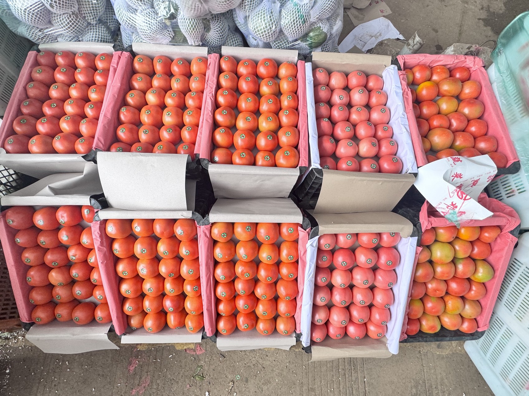批发市场内番茄每斤售价在4.5至5元区间内。