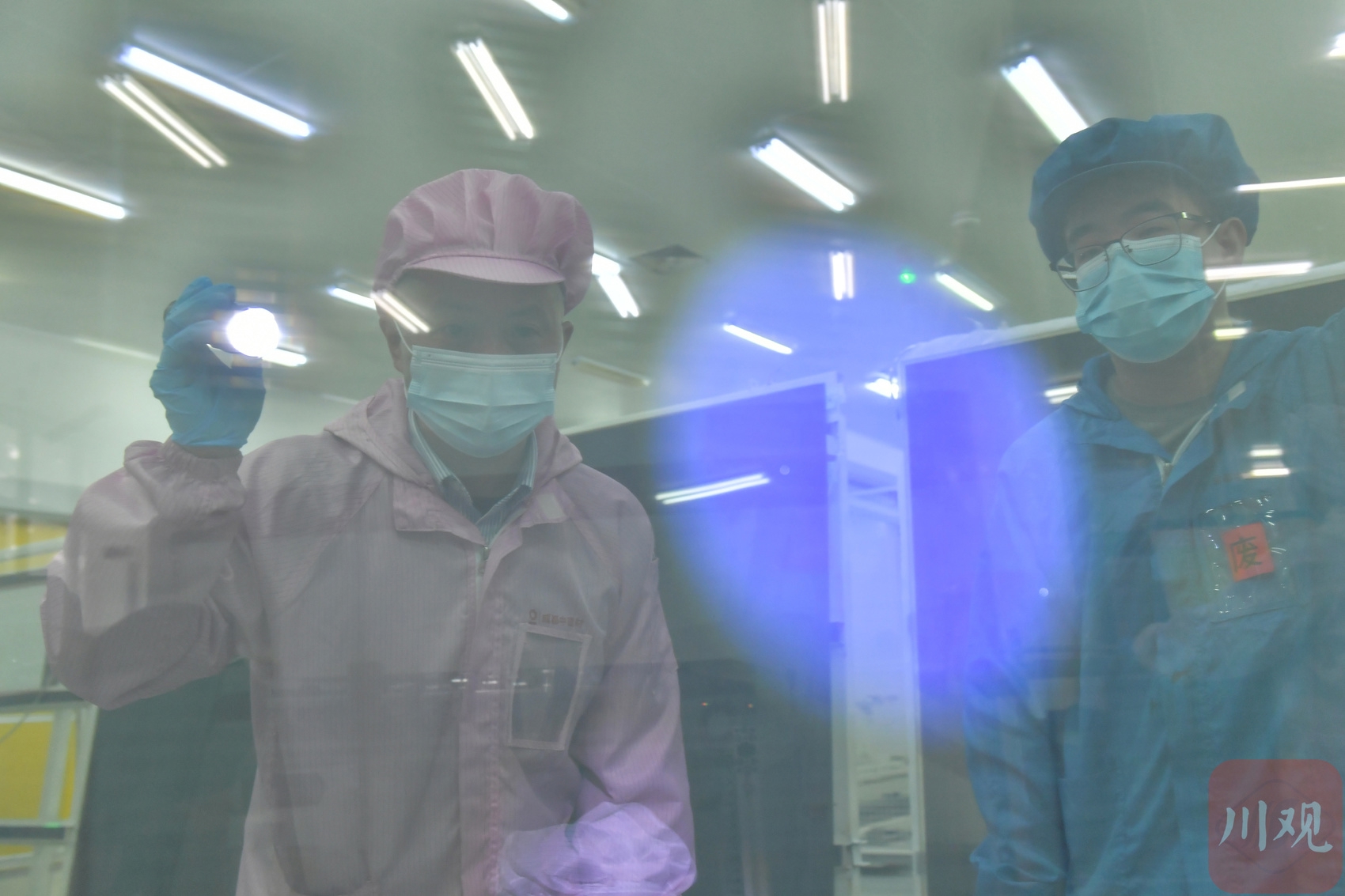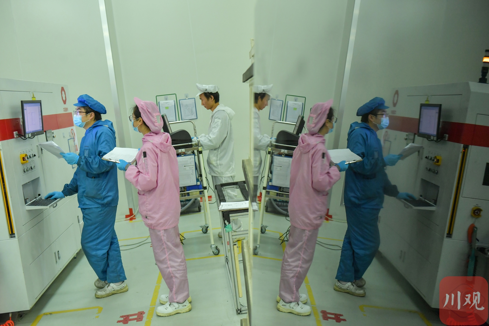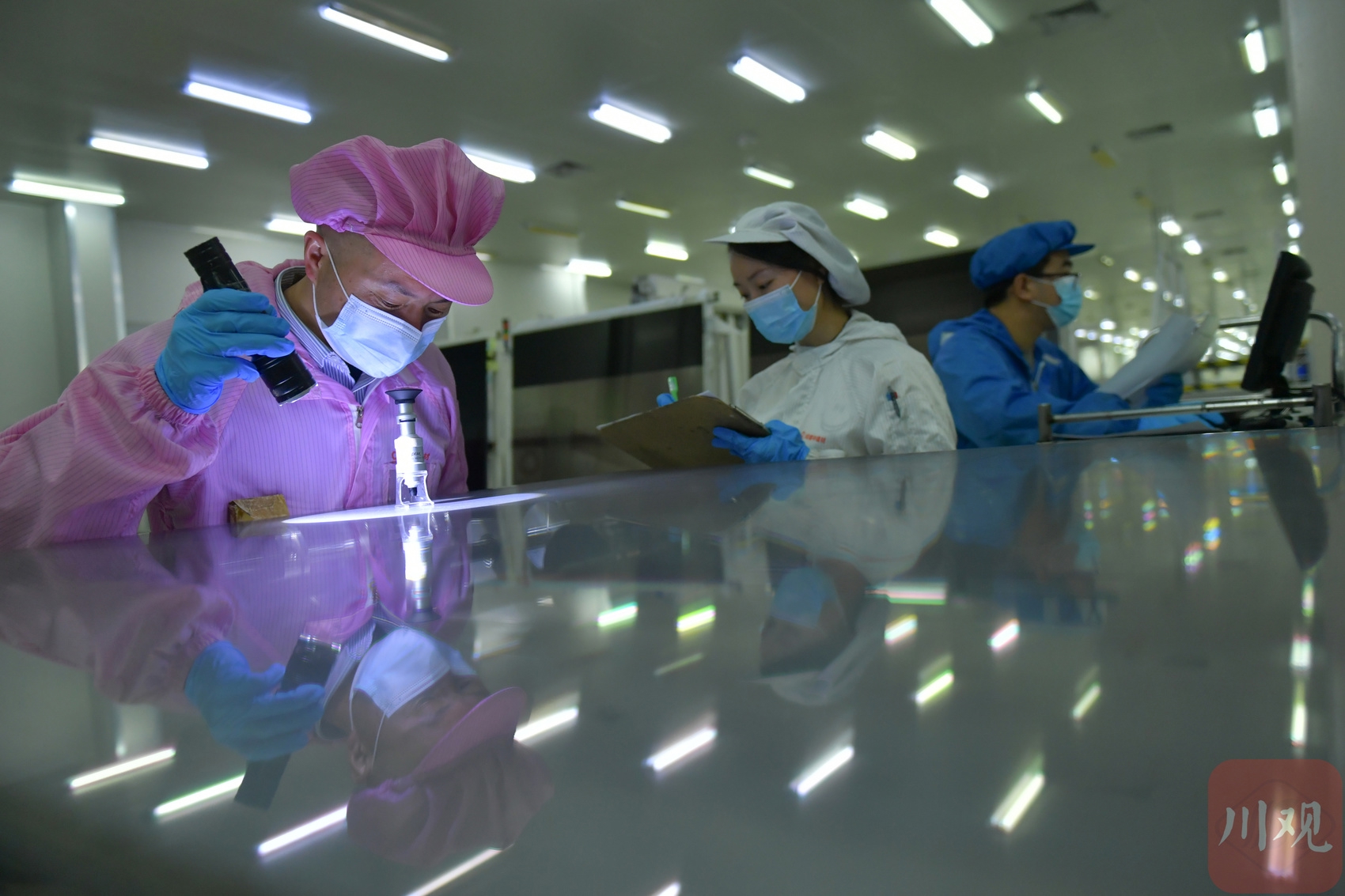 2025年12月11日,位于成都市双流经济开发区的成都中建材光电材料有限公司生产车间,工作人员检查碲化镉发电玻璃透光度。