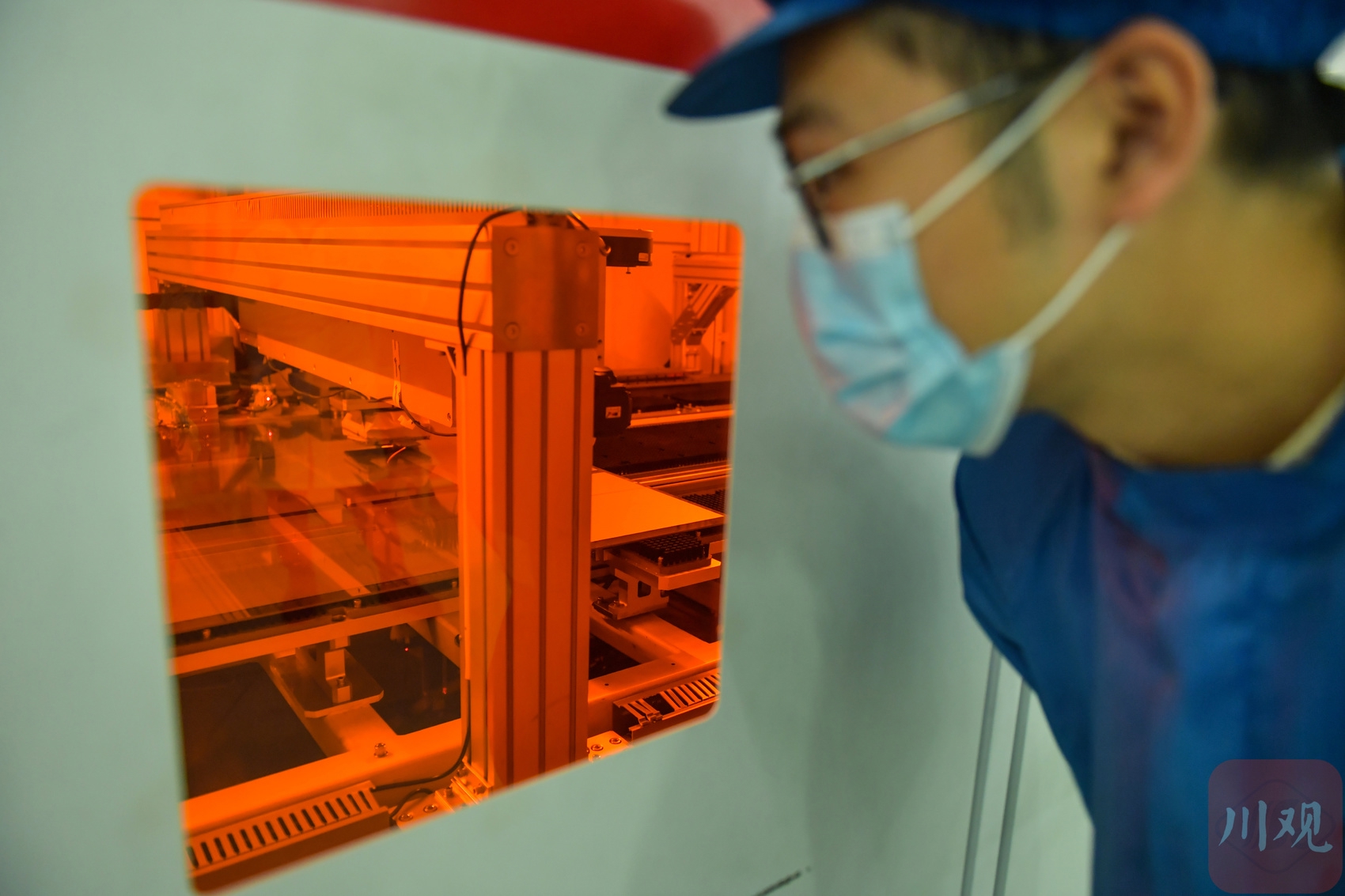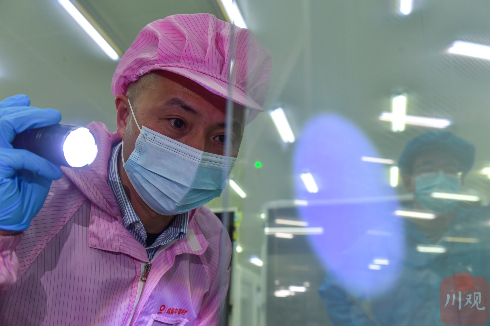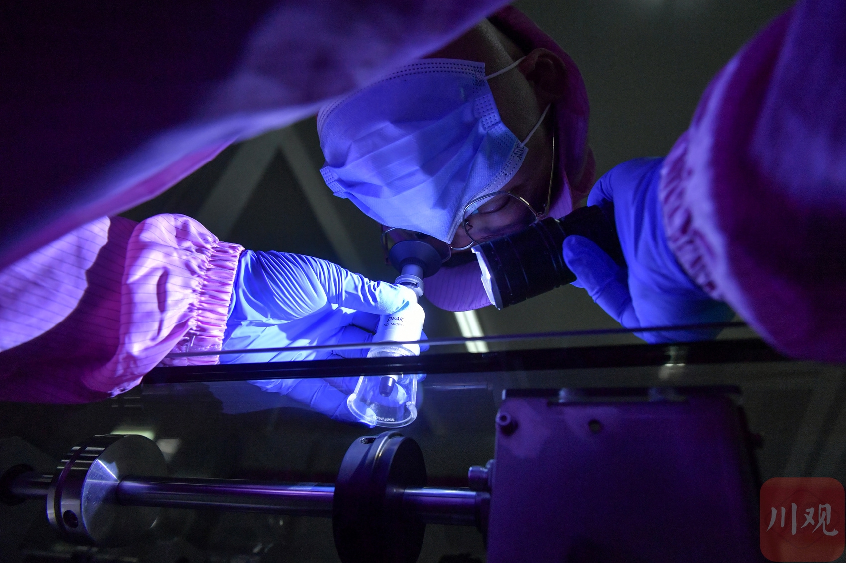 2025年12月11日,位于成都市双流经济开发区的成都中建材光电材料有限公司生产车间,工作人员检查碲化镉发电玻璃透光度。