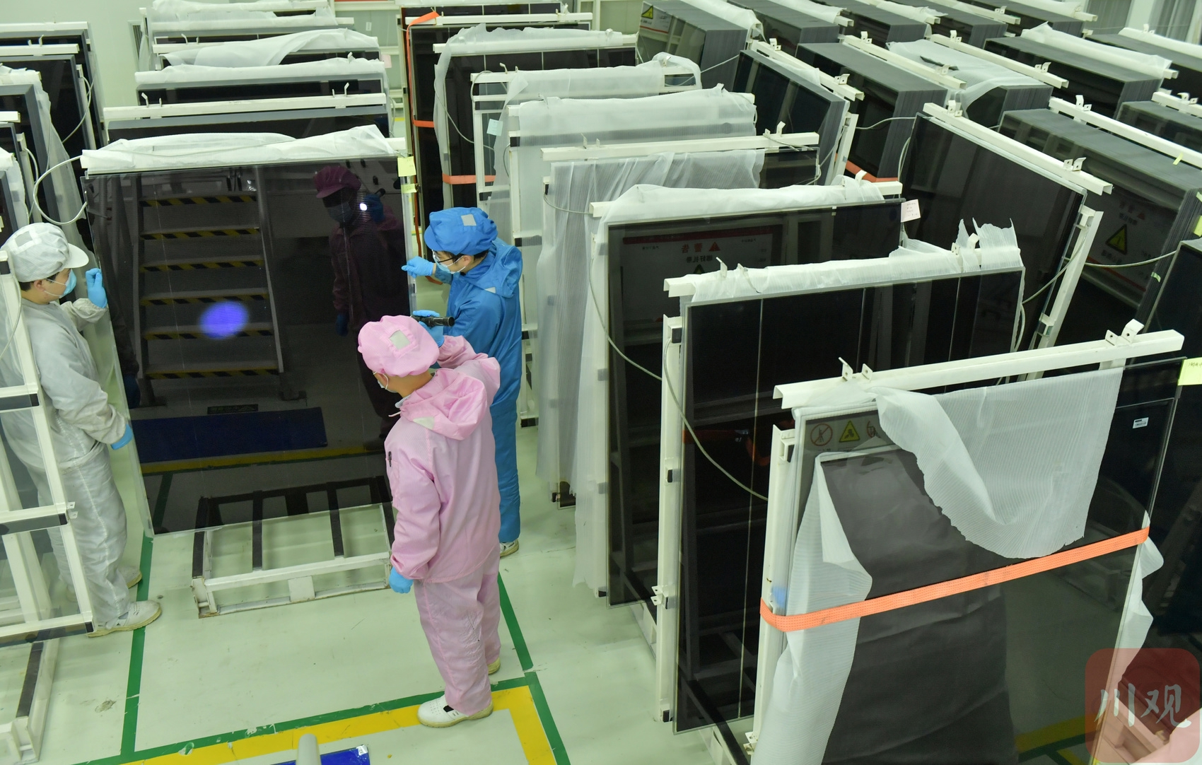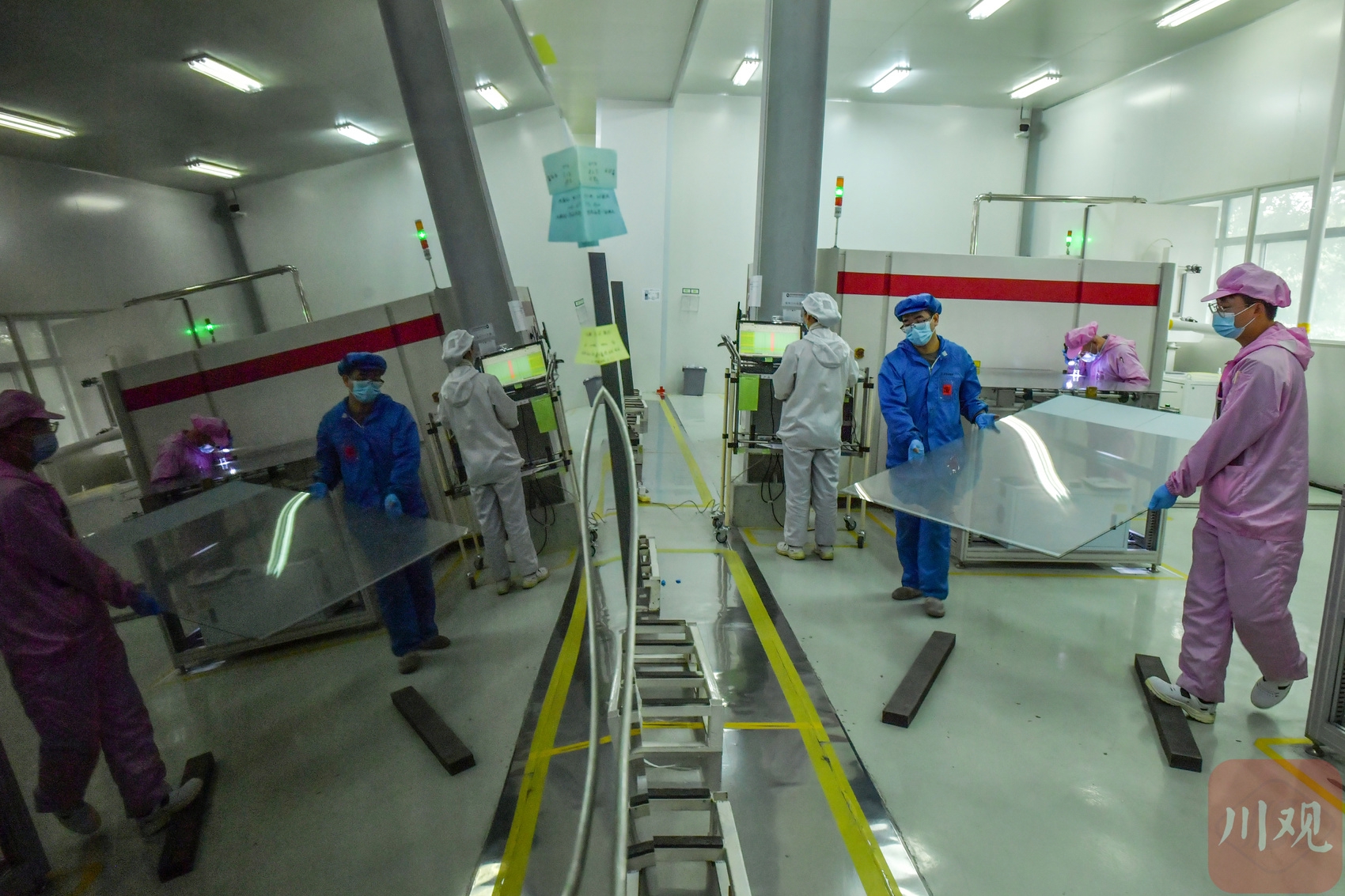 2025年12月11日,位于成都市双流经济开发区的成都中建材光电材料有限公司生产车间,工作人员检查并集中摆放碲化镉发电玻璃。