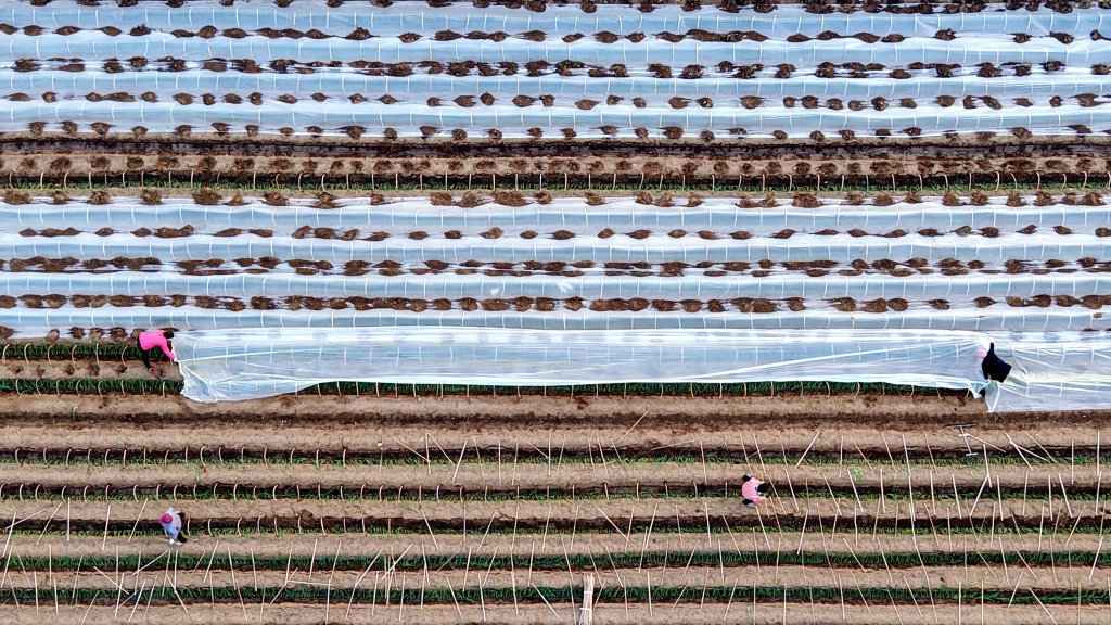 12月11日,在山东省临沂市平邑县地方镇,村民为种植的蔬菜幼苗覆盖保温薄膜(无人机照片)。