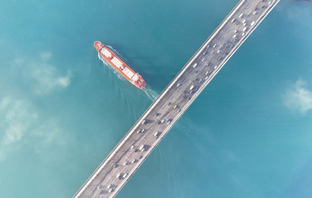 12月11日,在土耳其伊斯坦布尔,船只从横跨博斯普鲁斯海峡的大桥下通过(无人机照片)。