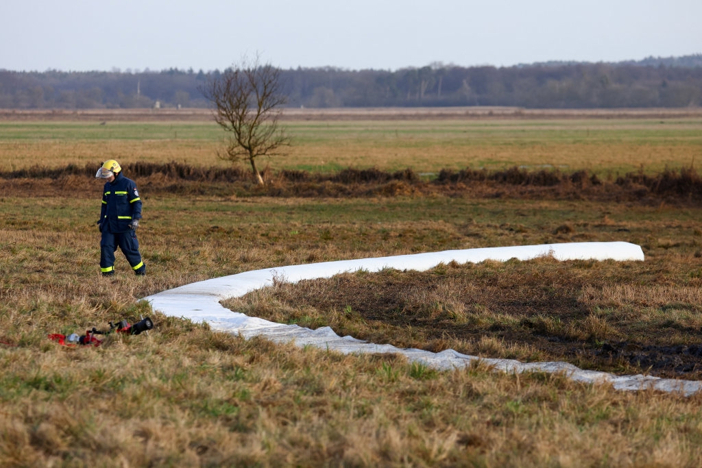 12月11日,在德国勃兰登堡州格拉姆措附近,一名工作人员在输油管道泄漏地点工作。