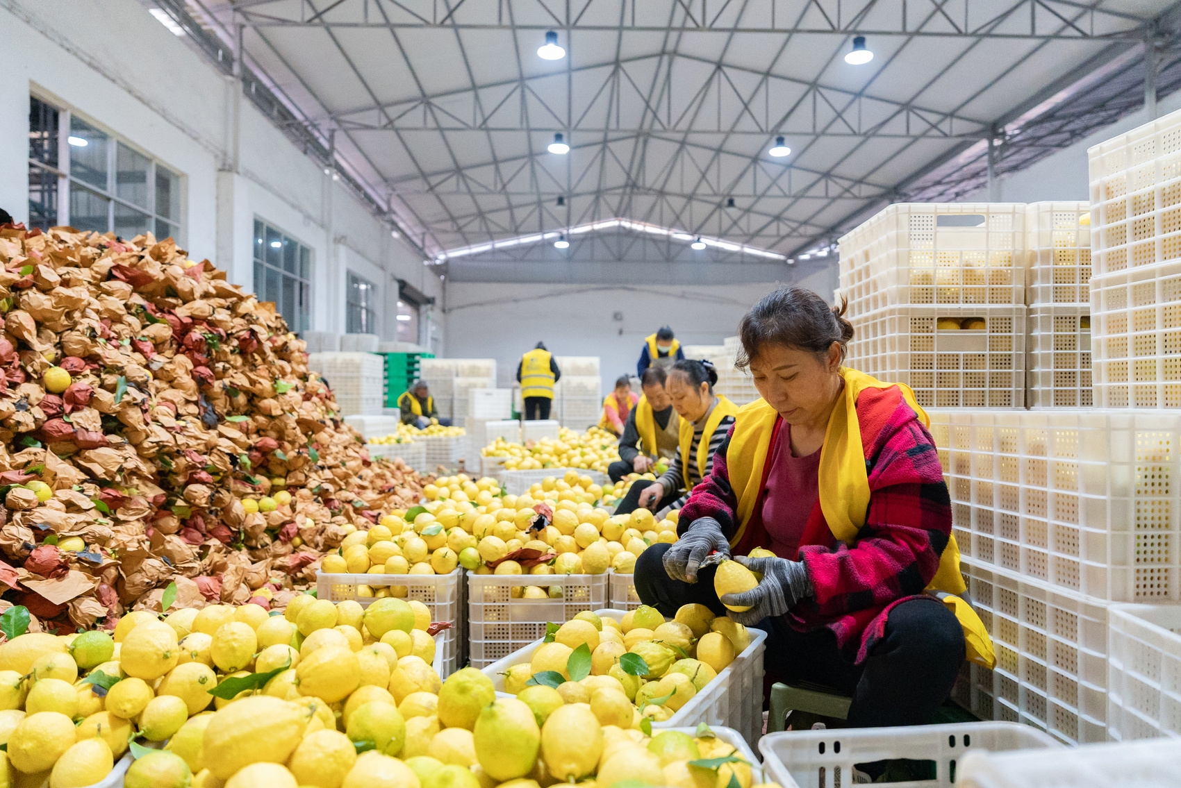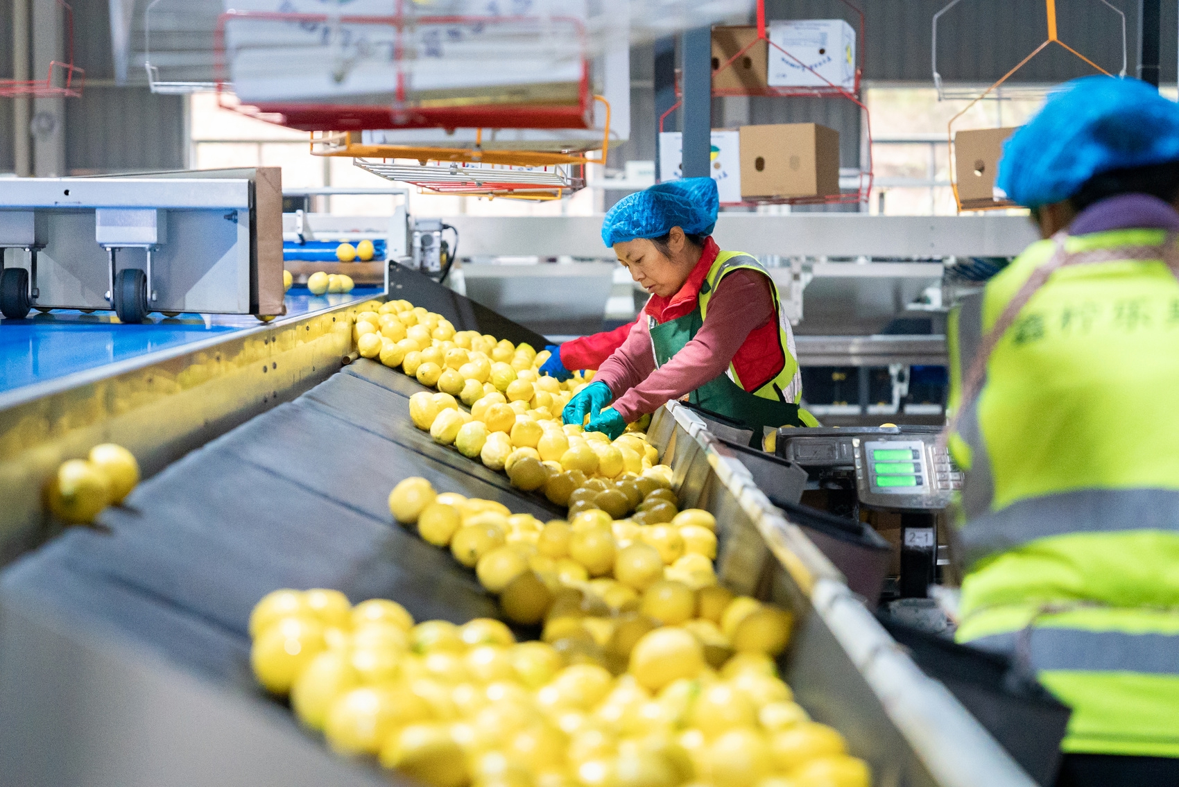 四川省鑫柠乐果业有限公司分拣车间,工人正在协助瑕疵分选线分拣柠檬。