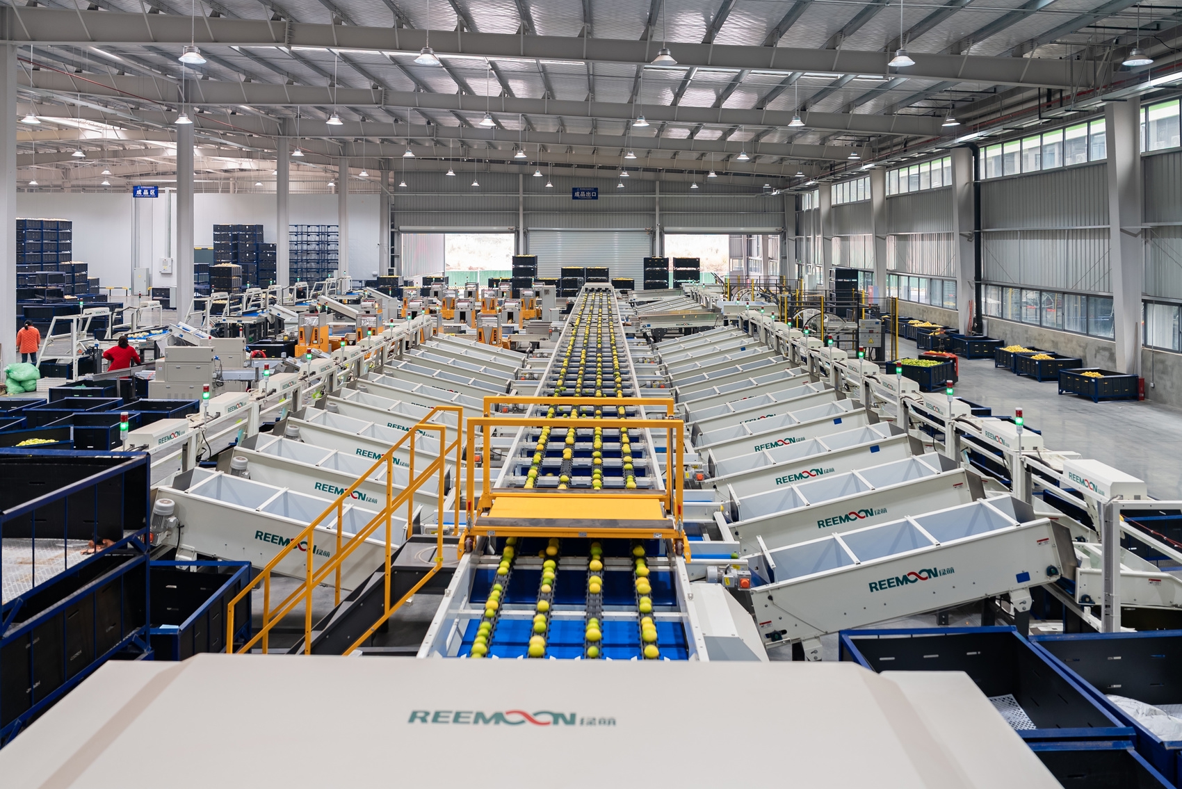 四川鹏瑞源食品有限公司的分拣车间,多功能六通道智能分选机在分拣柠檬。
