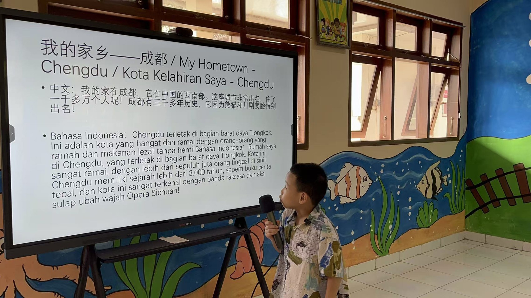 小墨一在巴厘岛向当地小朋友介绍自己的家乡。