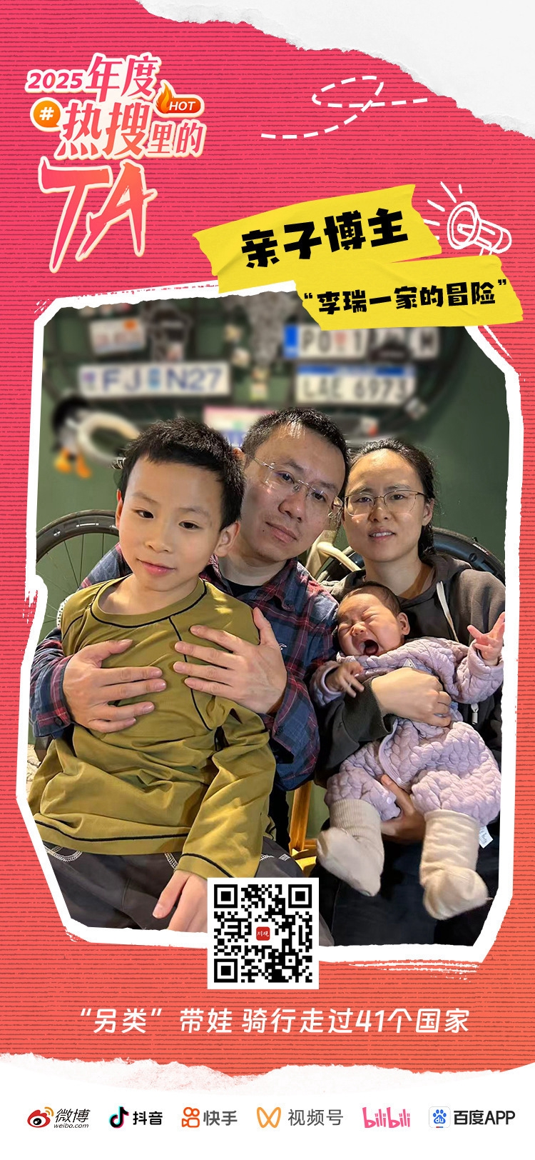此后,李瑞又陆续分享了一些全家旅行视频。其中一则记录:2023年1月,夫妇俩带着5岁的儿子,从成都出发转机沙特阿拉伯,开启了长达一年多的自行车亲子环球之旅。