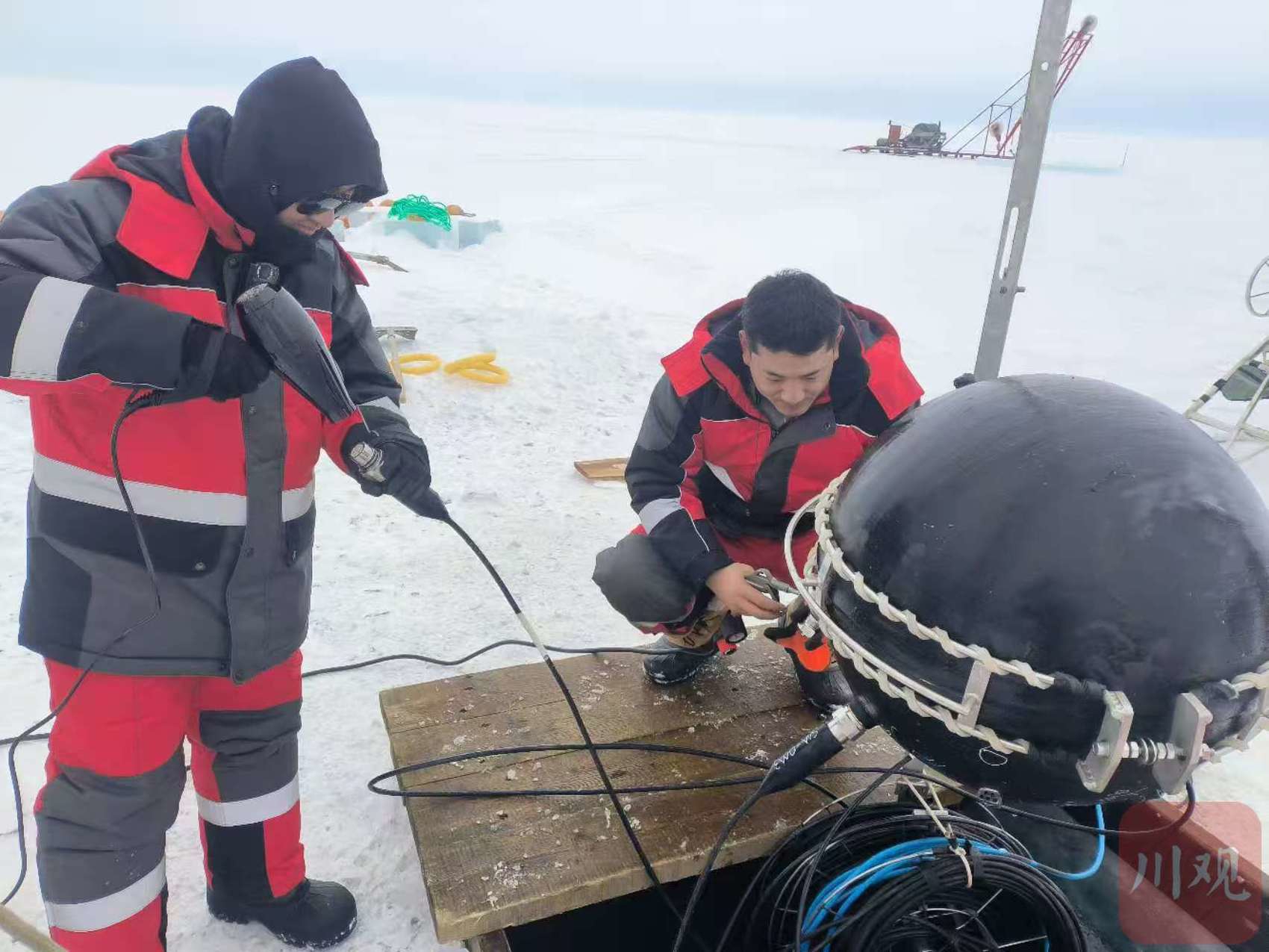 2025年3月,科研人员在俄罗斯贝加尔湖上投放光电倍增管到水下千米进行实验。(图片由李凯提供)